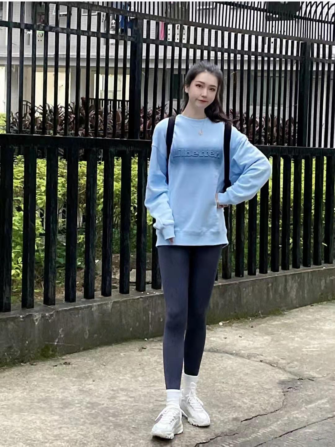 Sweatshirt outfit:The Lilbetter light blue sweatshirt with super comfortable quality is super white. There is a gradient LOGO on the chest. The lower body is paired with gray oxygen shark pants. The gray color is really special and good-looking! , the legs are very thin, and there are no wrinkles at all. The shark pants perfectly lengthen the proportions of the legs, and they are perfect with dad shoes.
