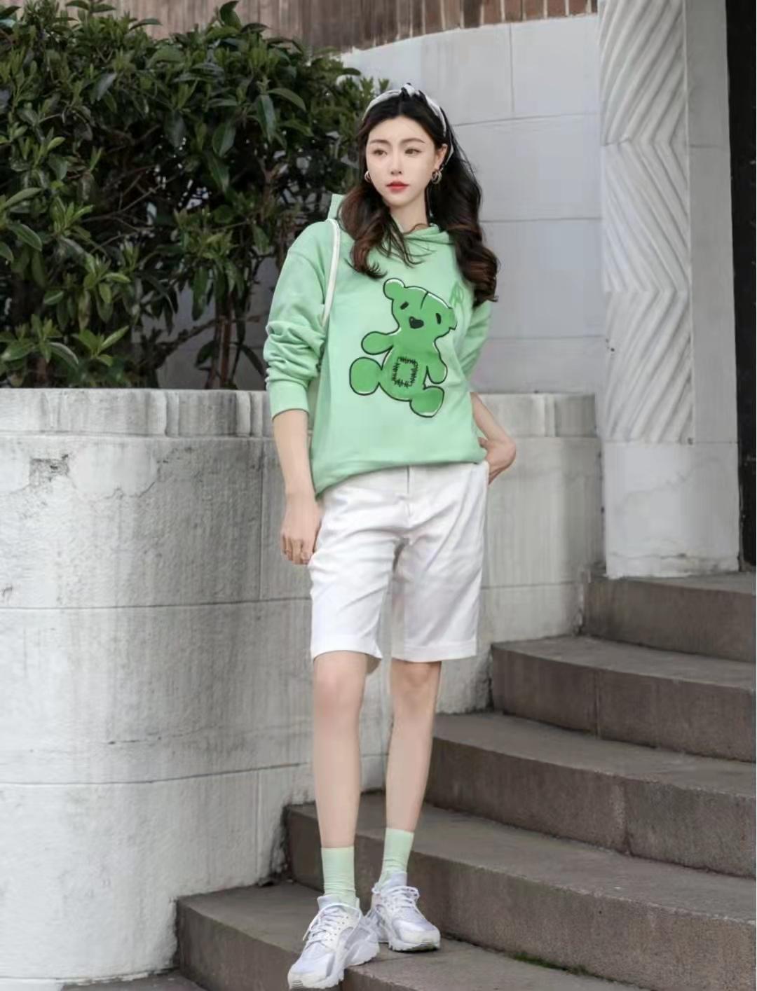 Sweatshirt outfit:The color of this sweatshirt is a relatively small and fresh green, which is reminiscent of mint-flavored colored hard candies. The oversized version adds a lazy and casual feeling, and is paired with white The three-quarter length pants have a more Japanese and clean style, and a pair of the most classic white sneakers give it a youthful feel. Paired with socks of the same color, it emphasizes the presence of the color of the sweater, and the overall look will be more energetic and younger.