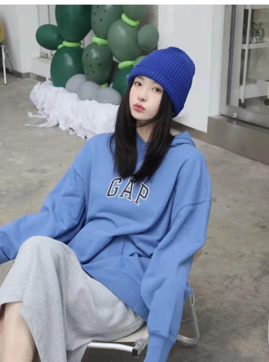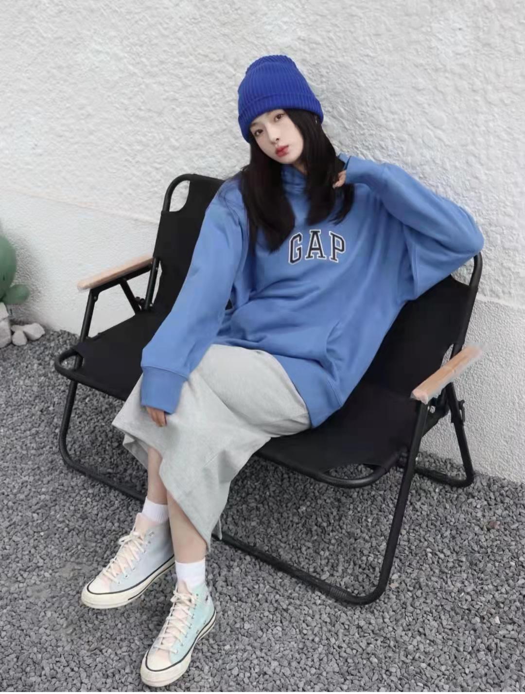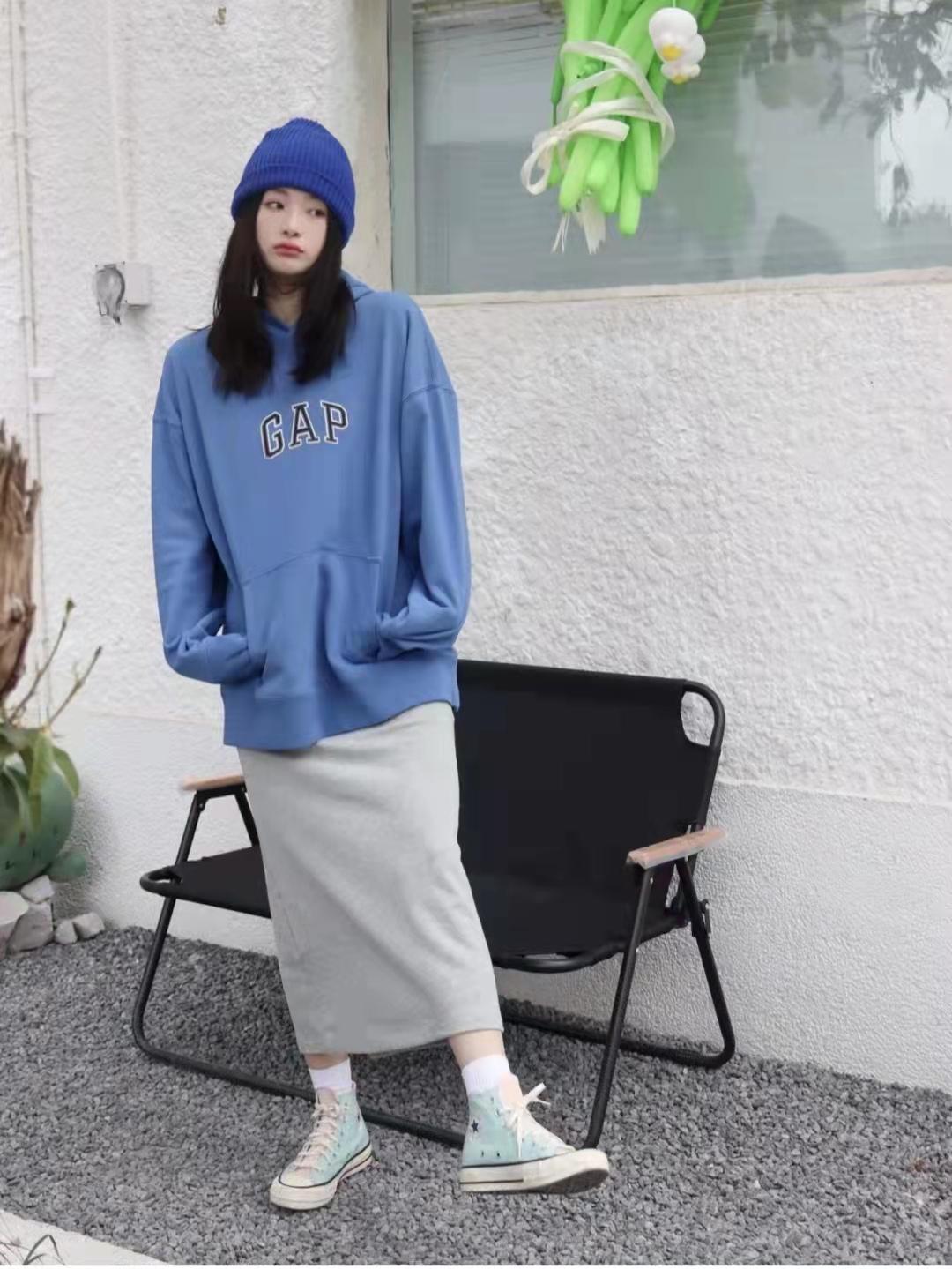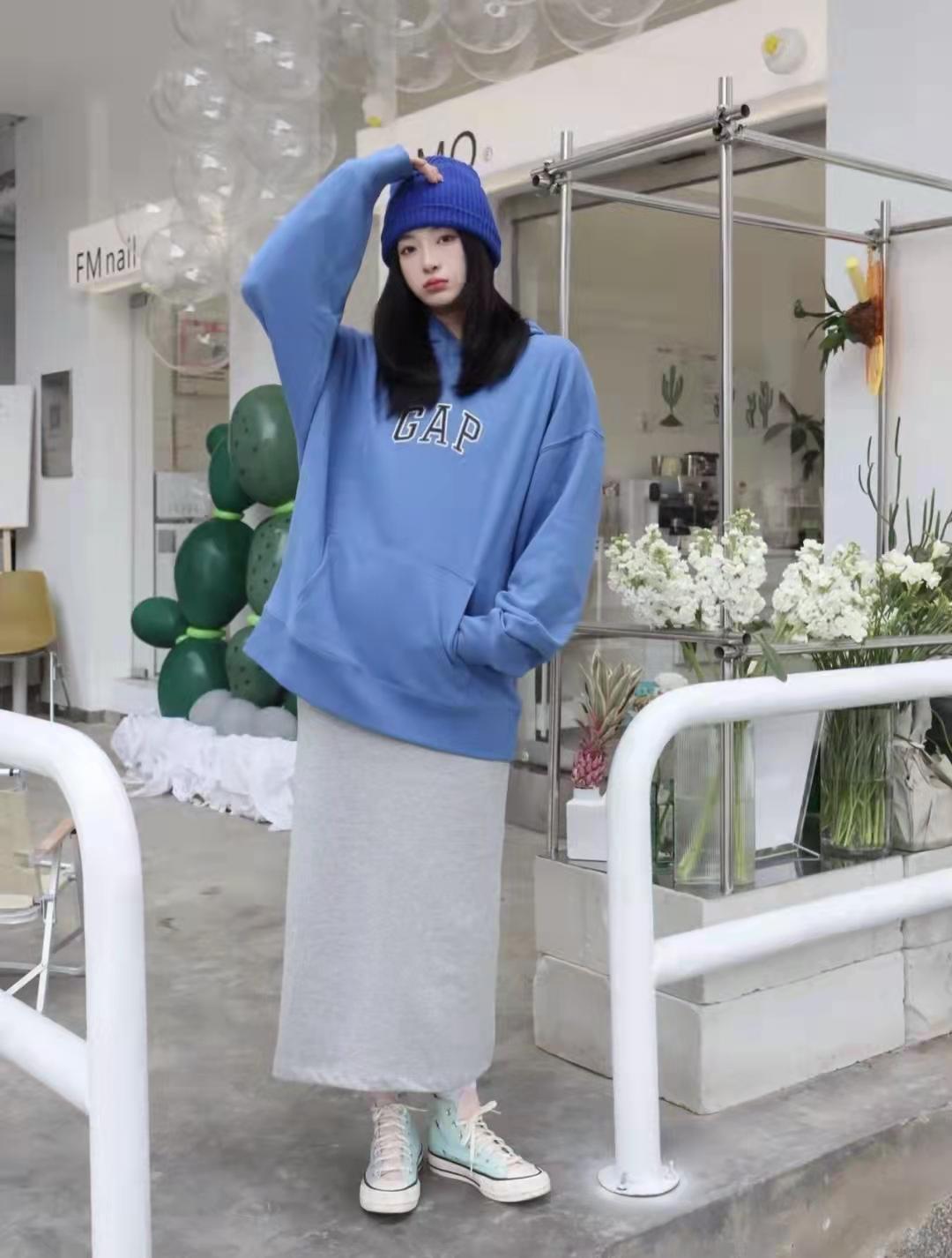 Sweatshirt outfit: springI like to wear comfortable and casual sweatshirts that look great in daily life! This blue loose hooded sweatshirt has a lazy temperament on the upper body, and the lower body is gray Half-length skirt + white canvas shoes, a set that is gentle, white and fashionable.