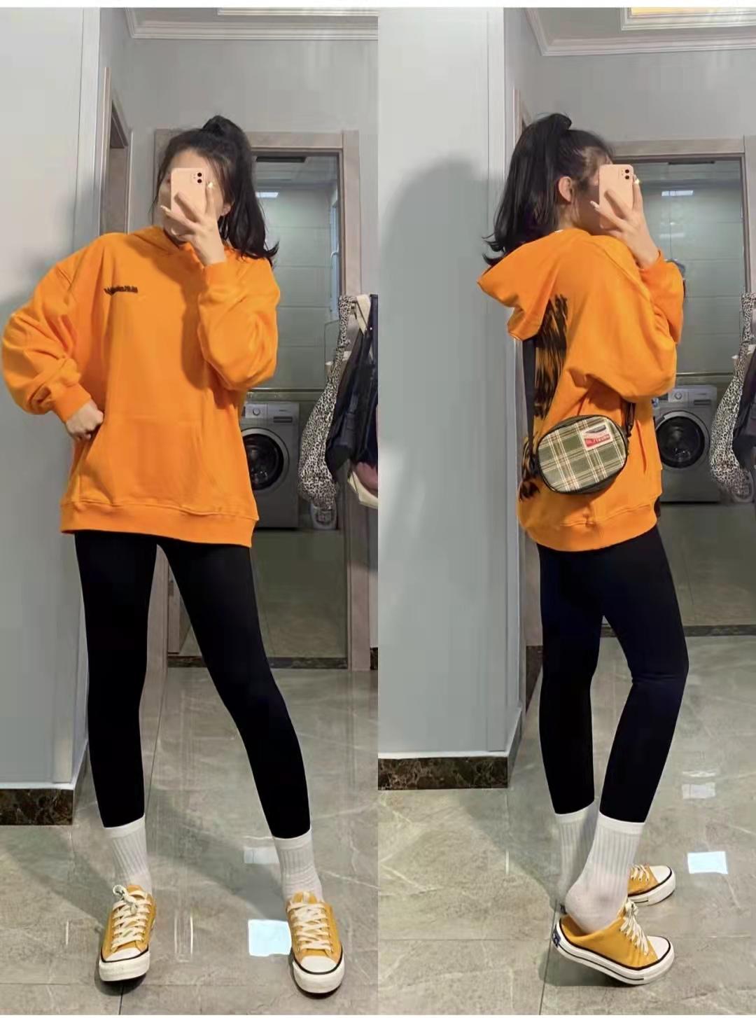 Sweatshirt outfit:The length of the orange sweatshirt can cover the pp. It has a cool printed pattern on the back. Although it is a loose version, it does not look thick on the back when viewed from the side. It is moderately thick and is super comfortable to wear. ; The black shark pants paired with the lower body look very slimming, and the butt-lifting effect is very satisfactory. The high-waisted version also has a waistband, which hides all the flesh.