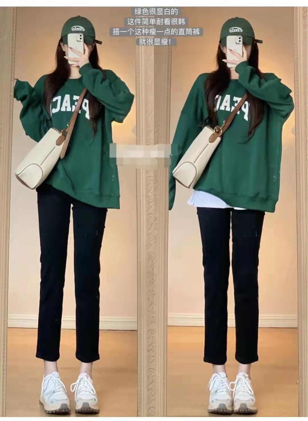Sweatshirt outfit: This outfit is a power style outfit that is loose at the top and tight at the bottom. The top is a white seasonal green sweatshirt, with a simple white letter pattern and an inner T-shirt. In response, the lower body is paired with small black straight-leg nine-point jeans and sneakers. The set looks taller, slimmer, and more elegant.
