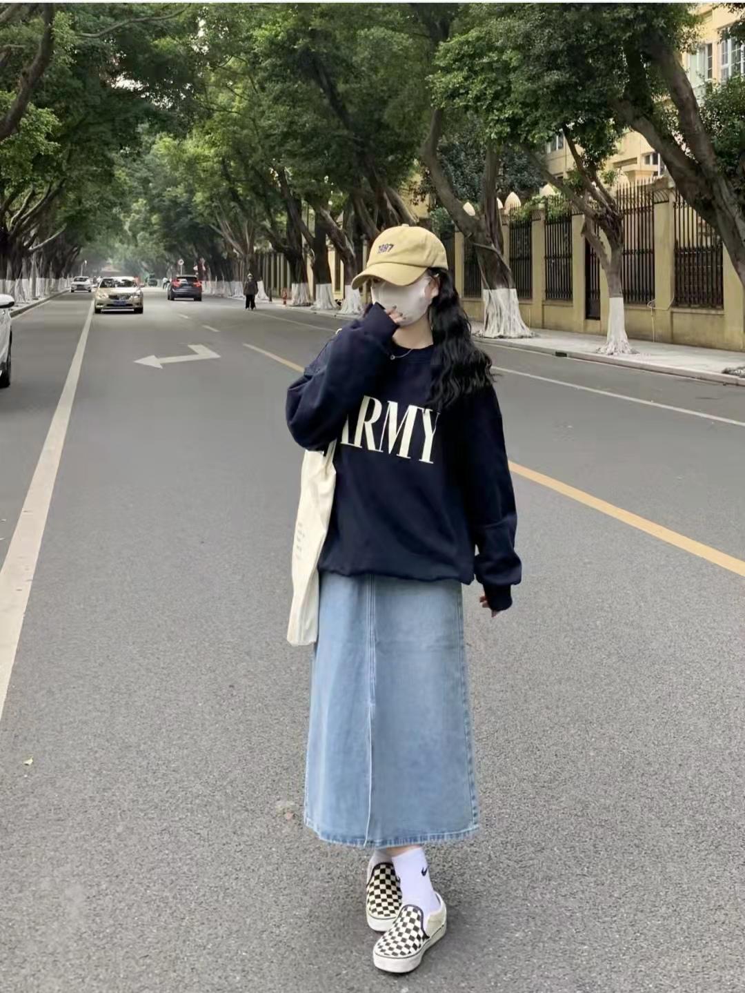 The lower body is paired with a light blue denim skirt with front slits. The skirt has a great shape. When paired with a sweatshirt, it lengthens the body proportions. The A-line shape is very slim and is very suitable for sisters with pear-shaped figures. The checkerboard canvas shoes on the feet add the finishing touch to this outfit.