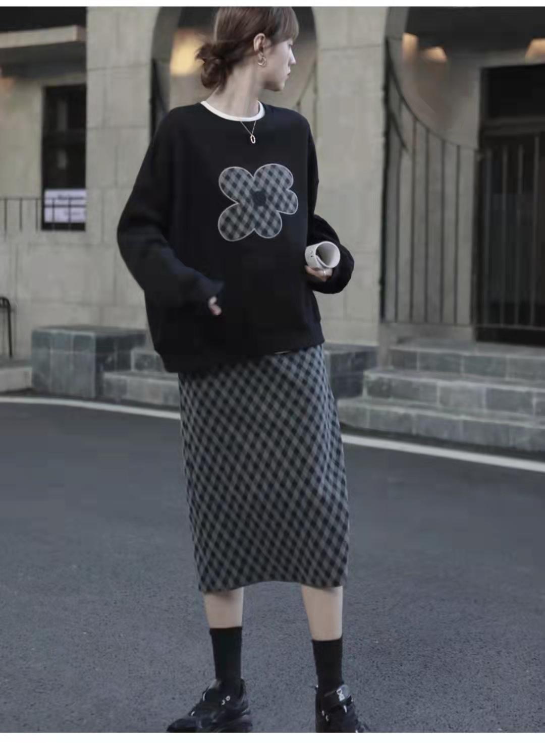Sweatshirt with skirt:The combination of a sweatshirt + skirt suit is worry-free and comfortable, and is a must-have for lazy people. Compared with ordinary sweatshirt and pants suits, the skirt suit is more Korean style, and the skirt also covers the flesh. Proportions, slimming yyds. The floral pattern on the chest and the plaid pattern combine to create a sense of fun and fashion. The skirt and the floral plaid are made of the same material, matching each other as a set, making it look non-stiff.