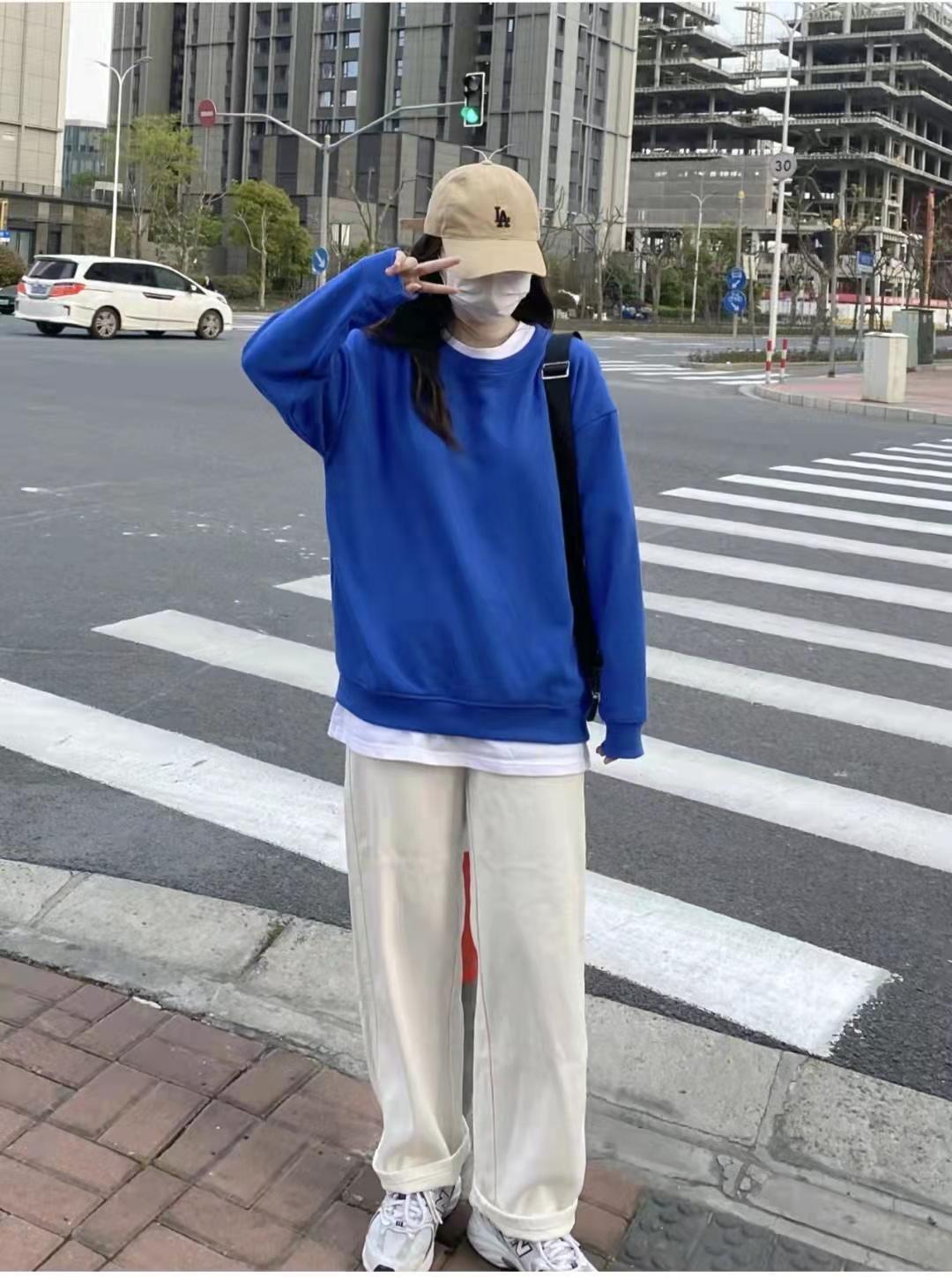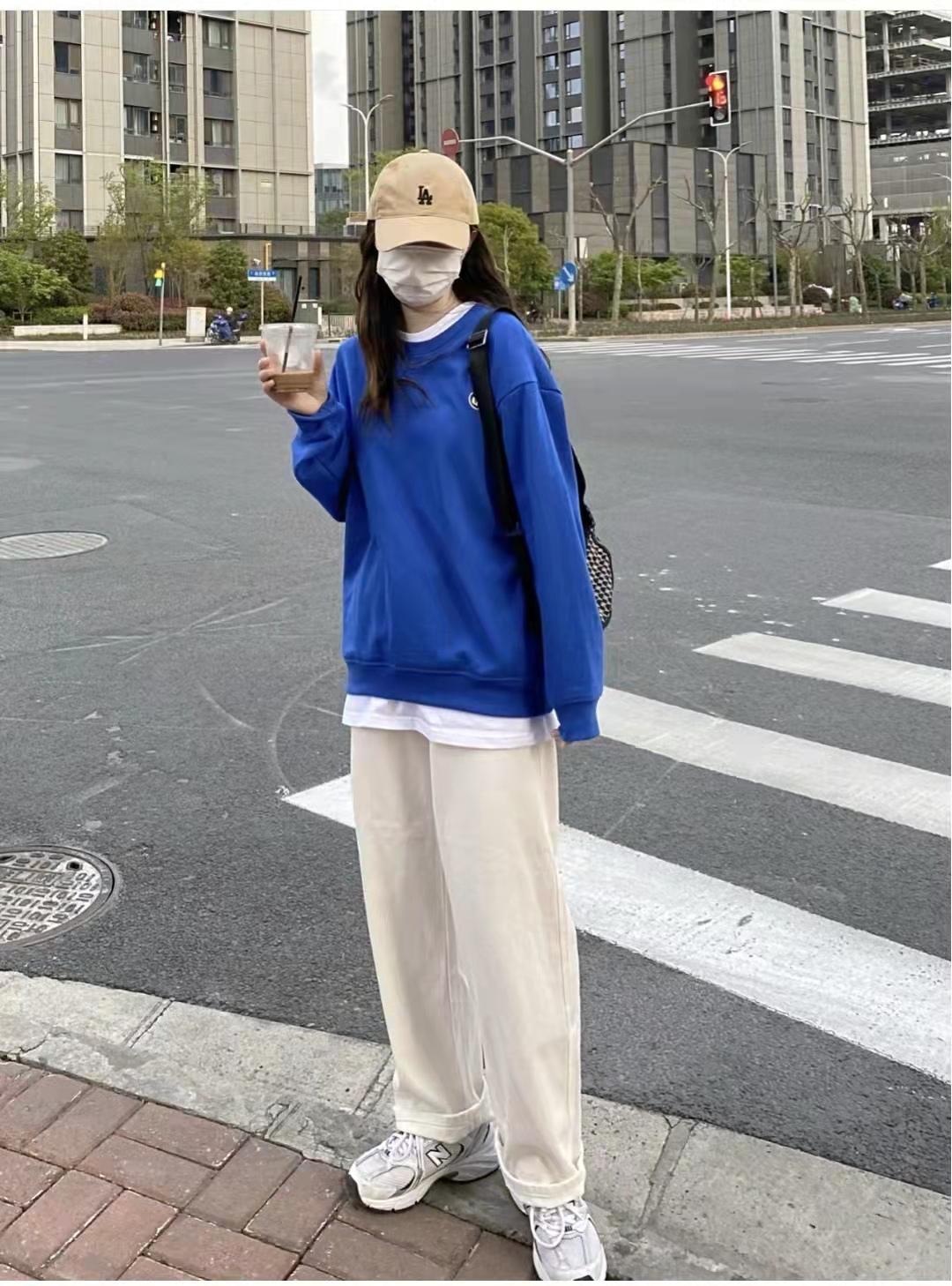 Sweatshirt outfit:The sapphire blue sweatshirt is too white. This is a thin style. It is suitable for the current temperature. Layer it with a white t-shirt to add a sense of layering! The white pants worn with the lower body are really versatile. This style is particularly good. I really like it for pear-shaped figures. Girls with thin waists and thick legs can also wear it!