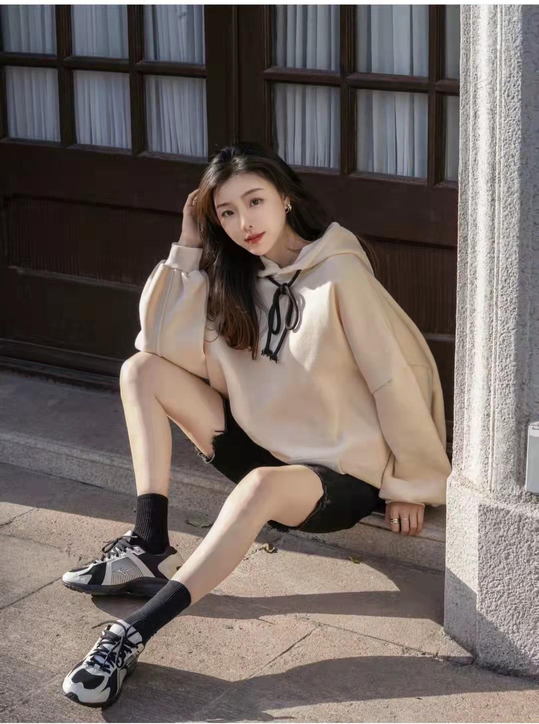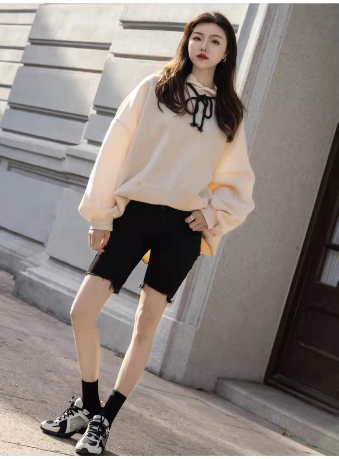 Sweatshirt outfit:The combination of black and beige is classic and fashionable, and you will never tire of it. Put on a loose beige hooded sweater, and clean denim shorts without any hesitation. There are only two contrasts in the whole body. The color is not monotonous or fancy, and it should be a sporty style that can span decades.