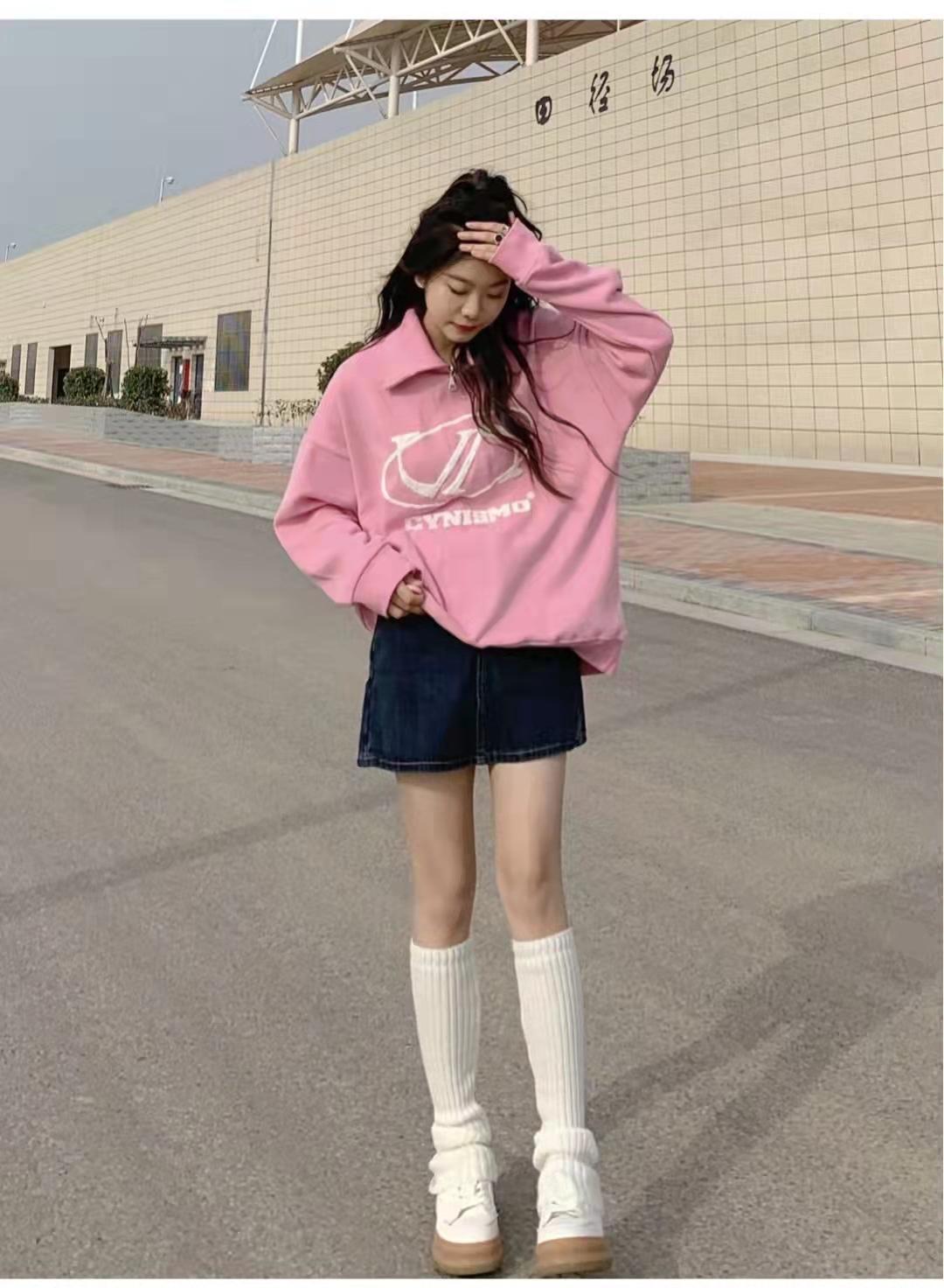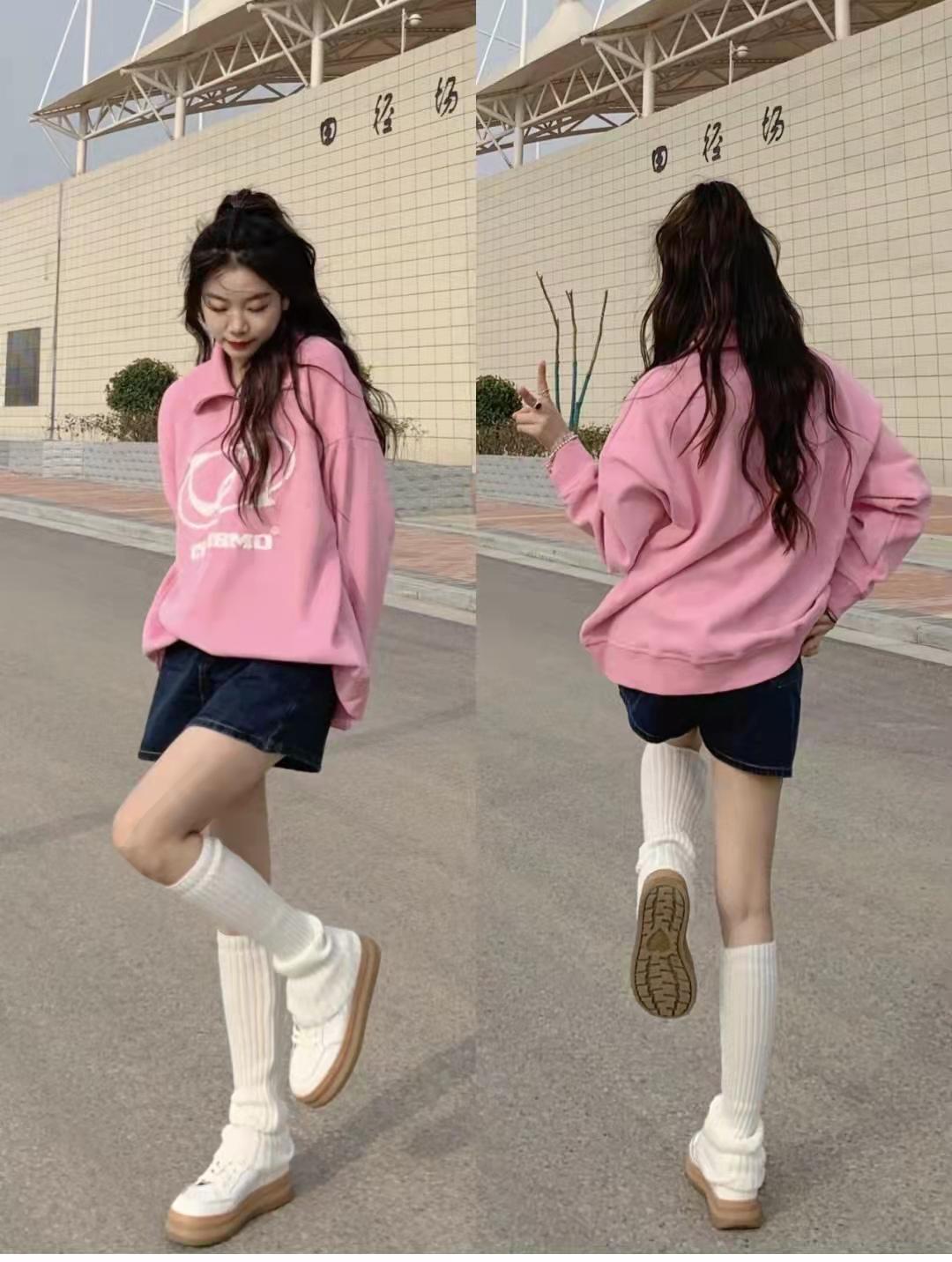 Sweatshirt outfit: This is a sweet Japanese-style outfit. The top is a pink sweatshirt. The polo collar design is more casual. The lower body is paired with dark blue denim shorts and white knitted calves. The addition of socks and thick white shoes adds sweetness to this outfit.