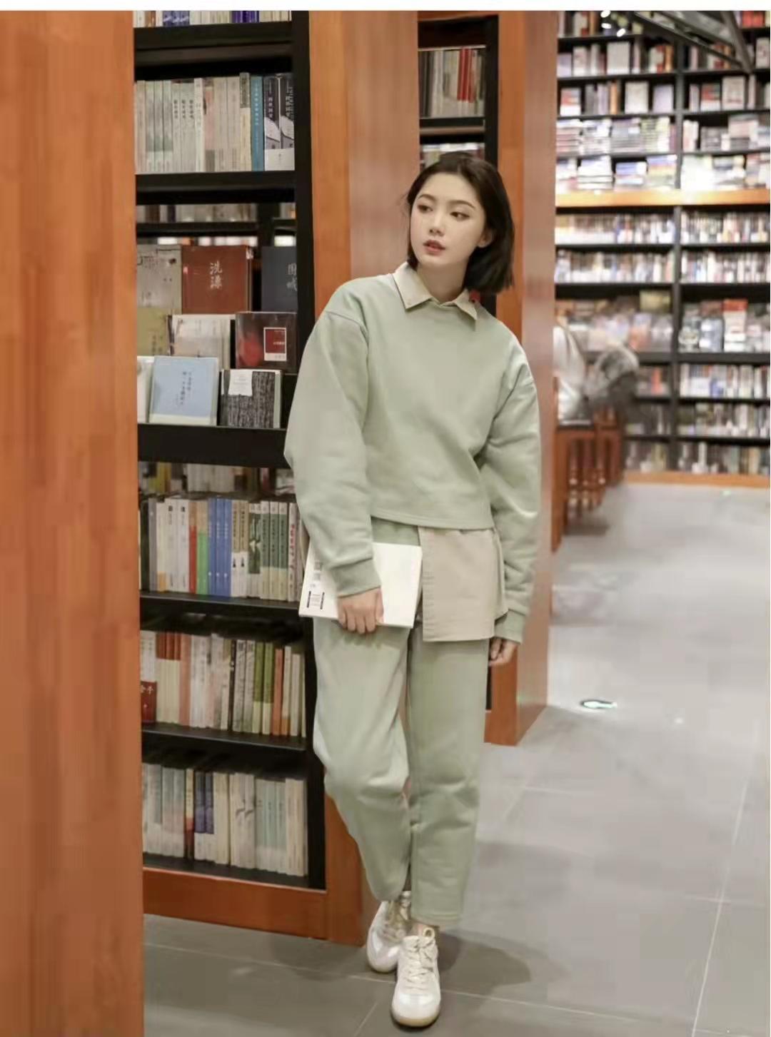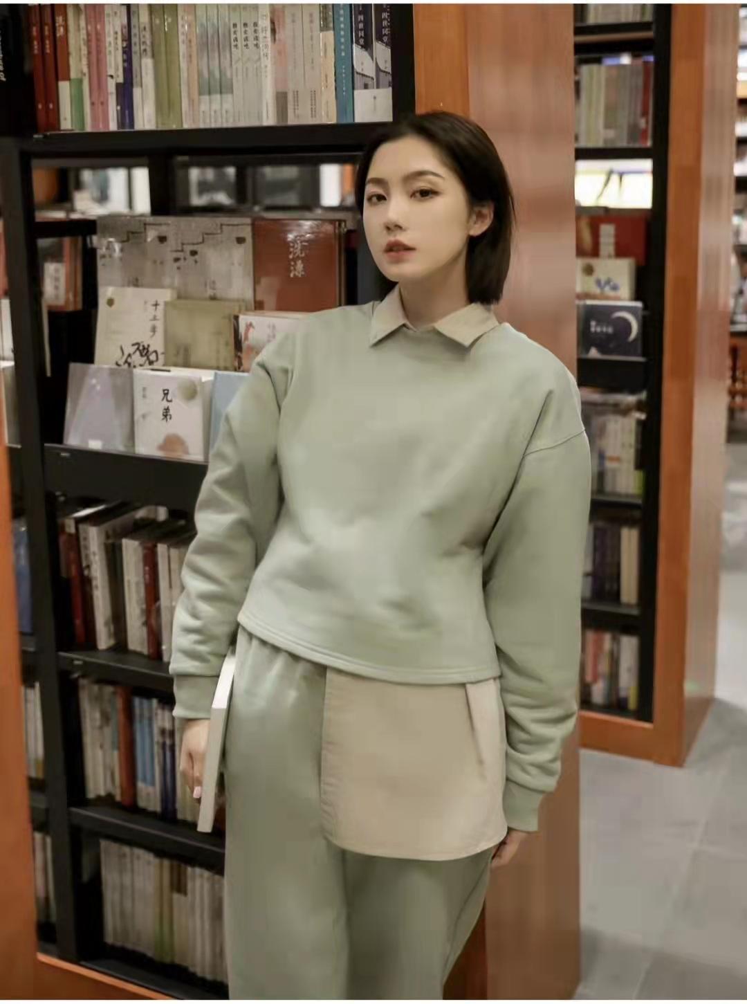 Sweatshirt outfit:French hoop weave soft sweatshirt, fashionable and simple, the light green upper body is very flattering to the skin tone, the touch is soft and waxy, it feels so springy, with khaki underneath The color shirt has a richer layering, and the pants are the same color sweatpants and Dexun shoes. The overall look is fresh and artistic!