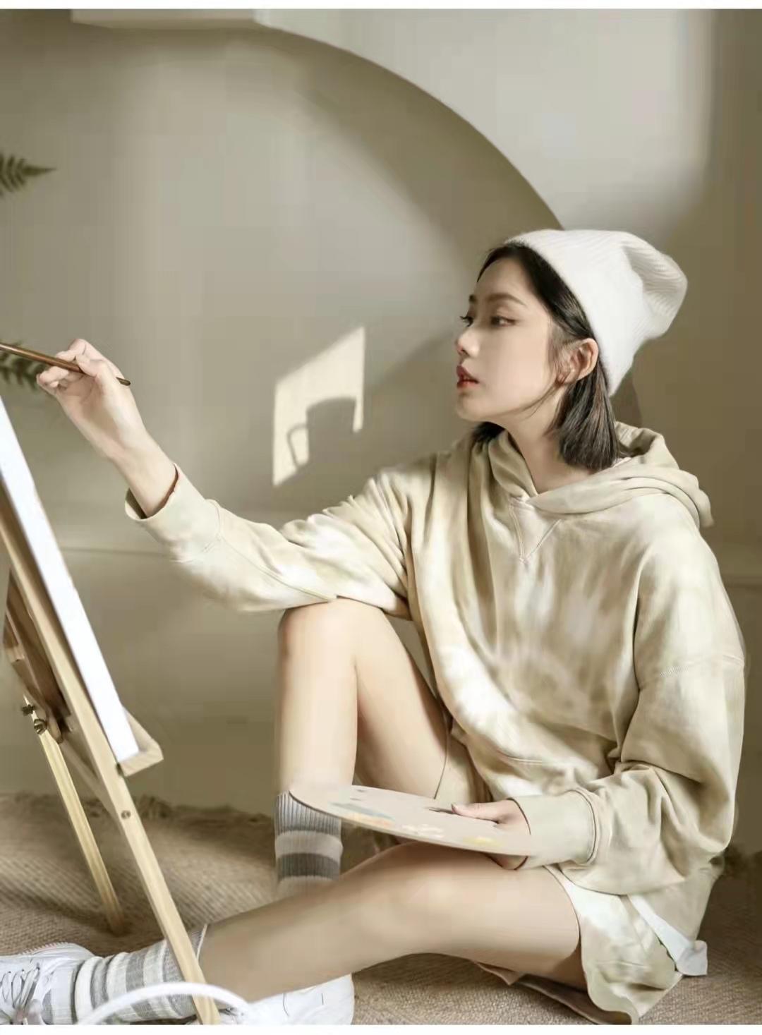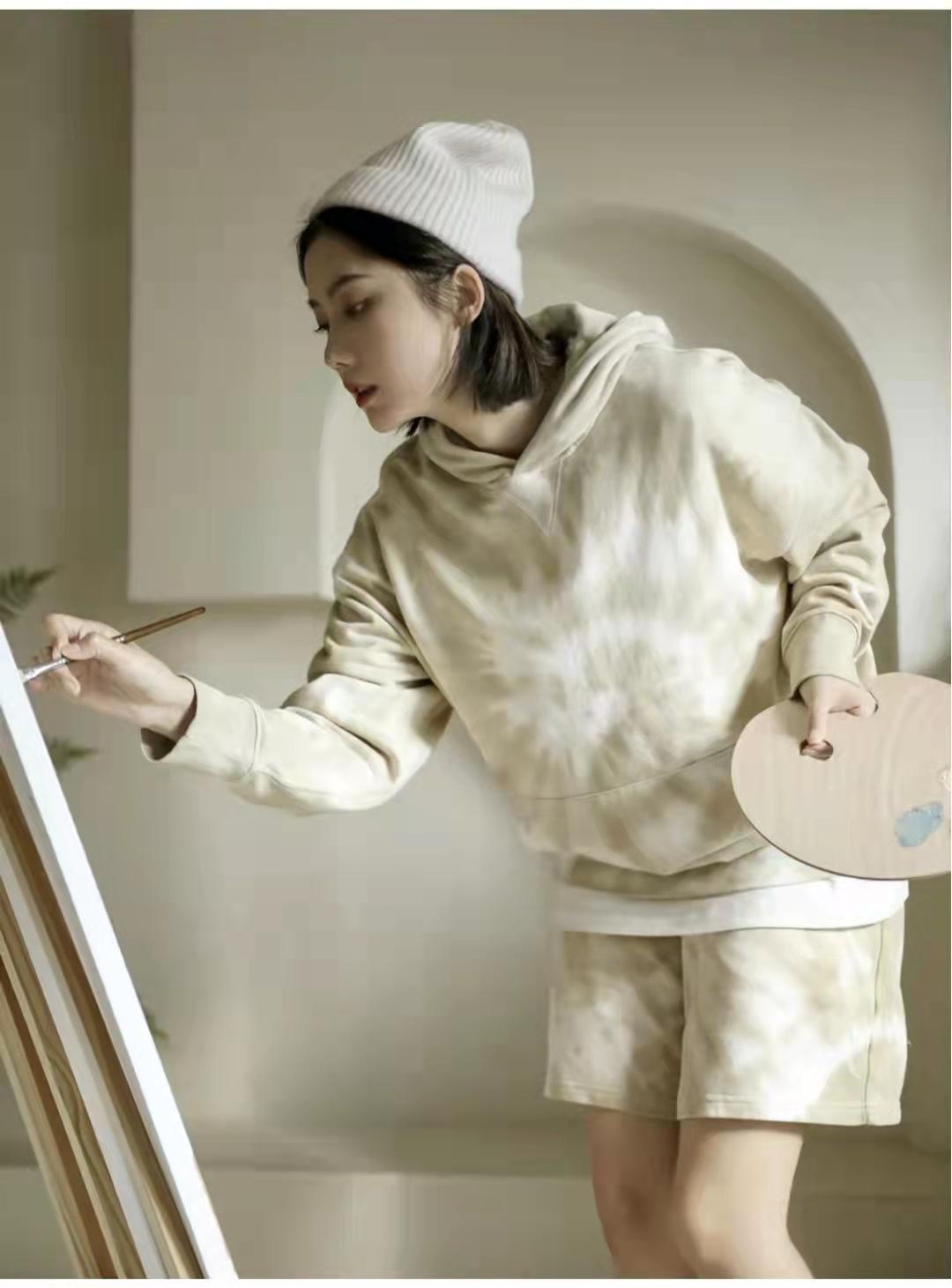 Sweatshirt outfit:The upper body of the hooded tie-dye soft sweatshirt is casual, energetic, comfortable and soft, with kangaroo pockets and a college style, and the pants match the same series The soft sweatpants are refreshing and simple to wear. The waist is elasticated to adjust the size. Paired with plain gray and white socks, the overall look is American street style and cool!