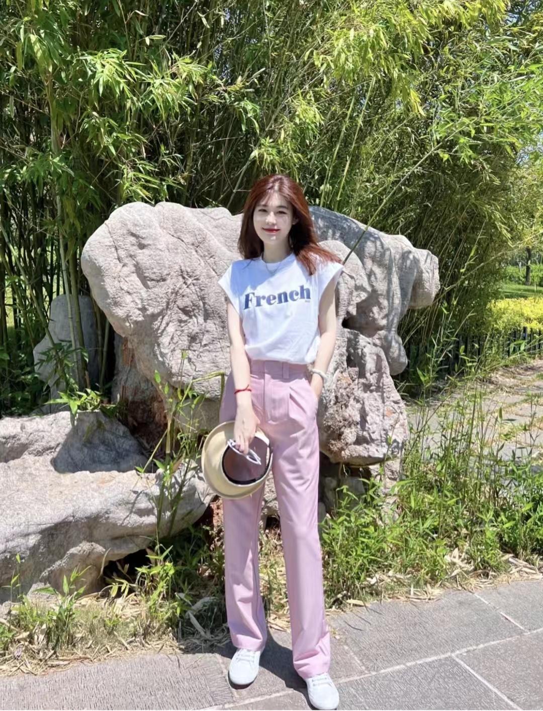 A white T-shirt and suit pants should be essential items in your wardrobe. You can easily go out in the morning and are suitable for commuting to work. You can also go shopping with friends for dinner and shopping after work. It is also suitable for wearing a straw bag for vacation.