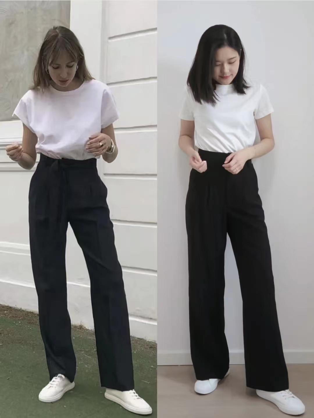 look5 white T-shirt + black high-waisted suit pants + white shoes