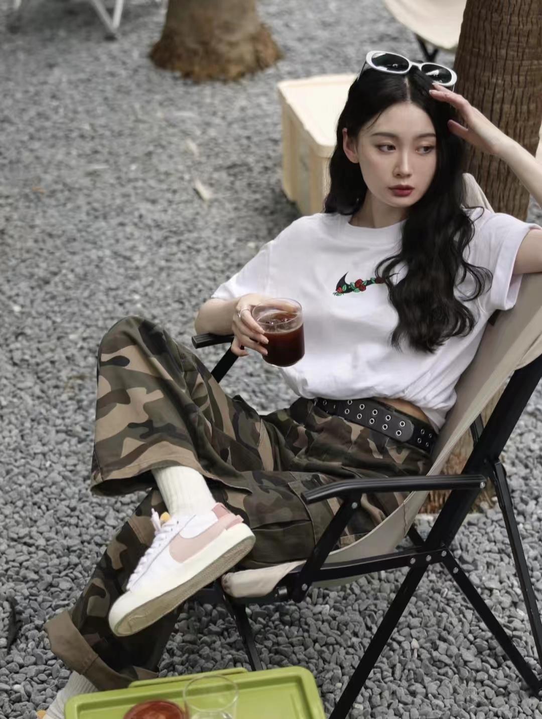 A set of casual and fashionable looks. I love the white embroidered T-shirt recently. It has a simple and exquisite embroidered logo. It can be worn alone. Or it looks good when worn underneath. The lower body is matched with the recently popular camouflage pants. It has a casual and comfortable city girl feel, and it is very photogenic!