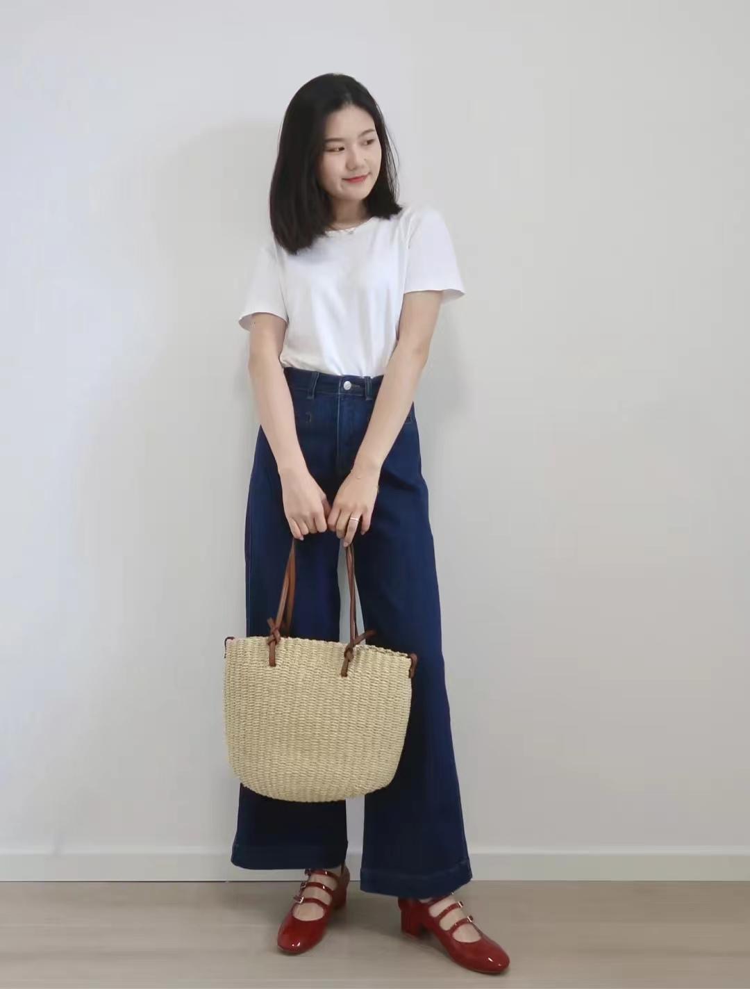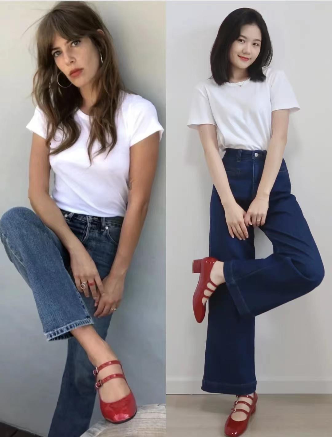 Follow the blogger and learn how to wear it: a white T-shirt can also be worn in French style, and the lower body is matched with a slightly flared one Wide-leg jeans, paired with vintage red Mary Jane, will bring out the French style. The inspiration for outfits comes from Emily Labowe. Her outfits are quite simple and elegant, with a hint of French laziness.