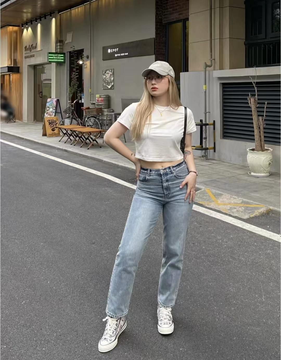 Although a white T-shirt and jeans are a simple combination, as long as the pattern is chosen well, it can show off your figure and make you look better. Spicy enough. The dressing formula is a moderately slim short white T + nine-point high-waisted straight jeans. (The T-shirt material is soft and hin, suitable for summer, and the shoulder design makes you look slimmer.) I don’t want to put on makeup, so I wear a low-saturation peaked cap + glasses frames .