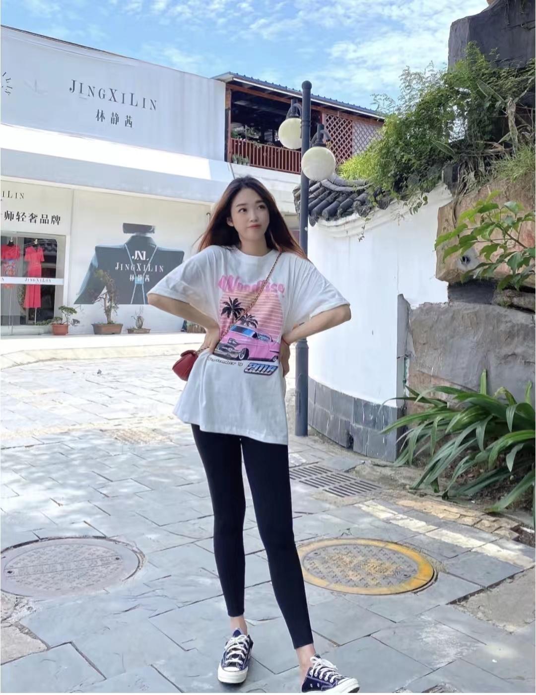 I don’t know what to wear when going out in summer It’s the right time to choose a T-shirt, it’s easy to wear and easy to match. The standard summer outfit is to be clean and refreshing. The cartoon print on the chest is pink and tender, which is girly and full of vitality. Paired with the black shark pants, it is very comfortable and very elastic. The matching rule of wide top + narrow bottom is slimming plus.