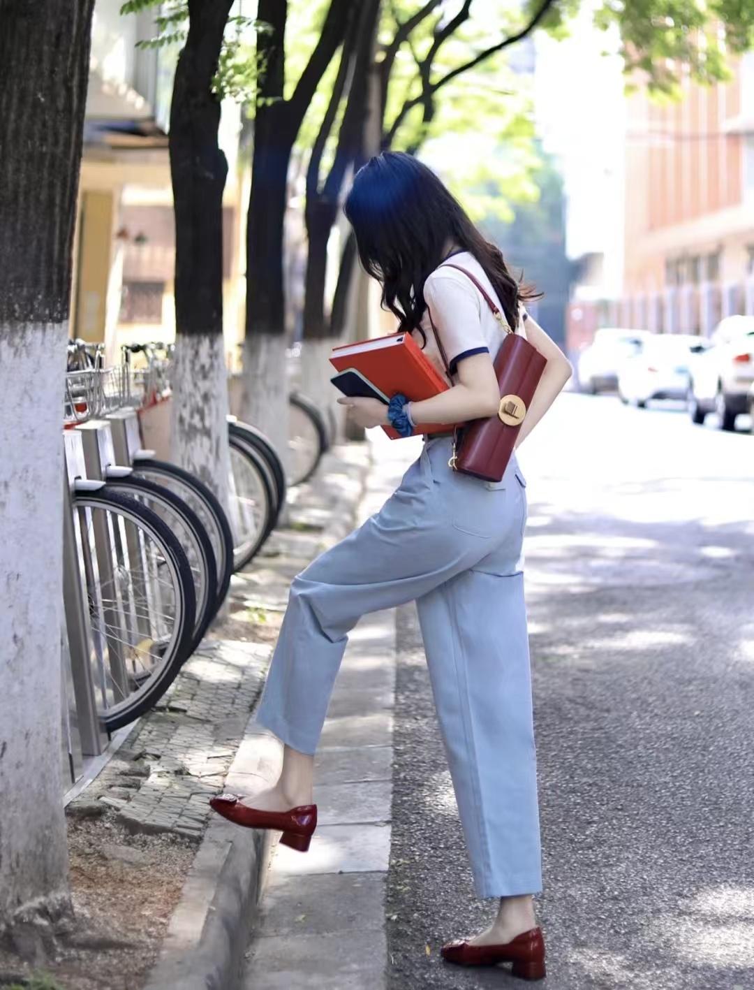 Summer loves simple, bright and comfortable outfits, shoulder-length The French T-shirt is very slimming, and the sky blue radish pants are friendly to a pear-shaped figure. Paired with red Mary Jane shoes, the lightweight square heels elongate the leg lines and provide perfect comfort.