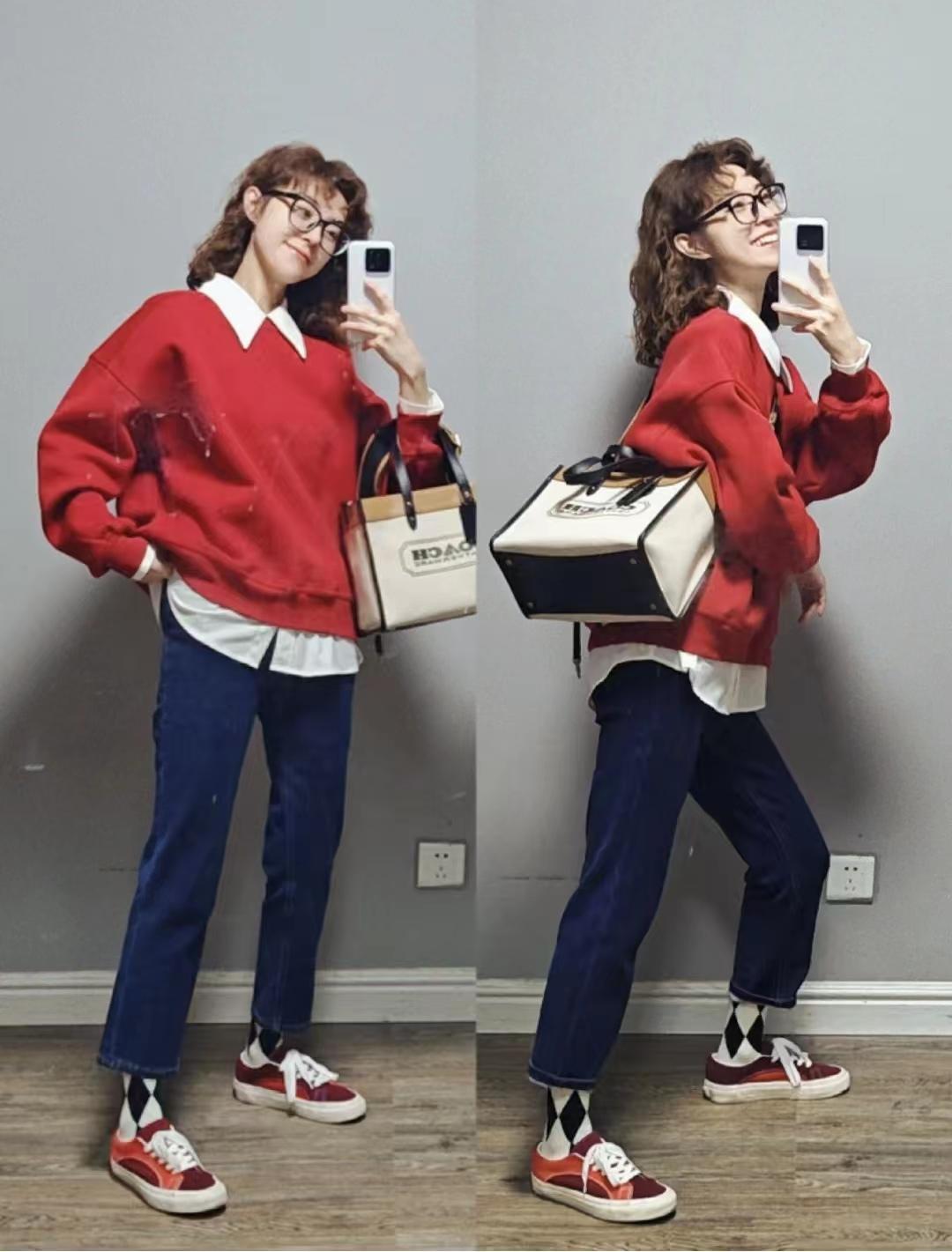 Spring It’s sweatshirt season! Compared to hooded sweatshirts, I prefer pullovers because the neck looks longer. The color of this one is great and white. The starry sky cotton fabric is quite wide and comfortable. The sweatshirts look really good when paired with shirts. The red and green colors match!