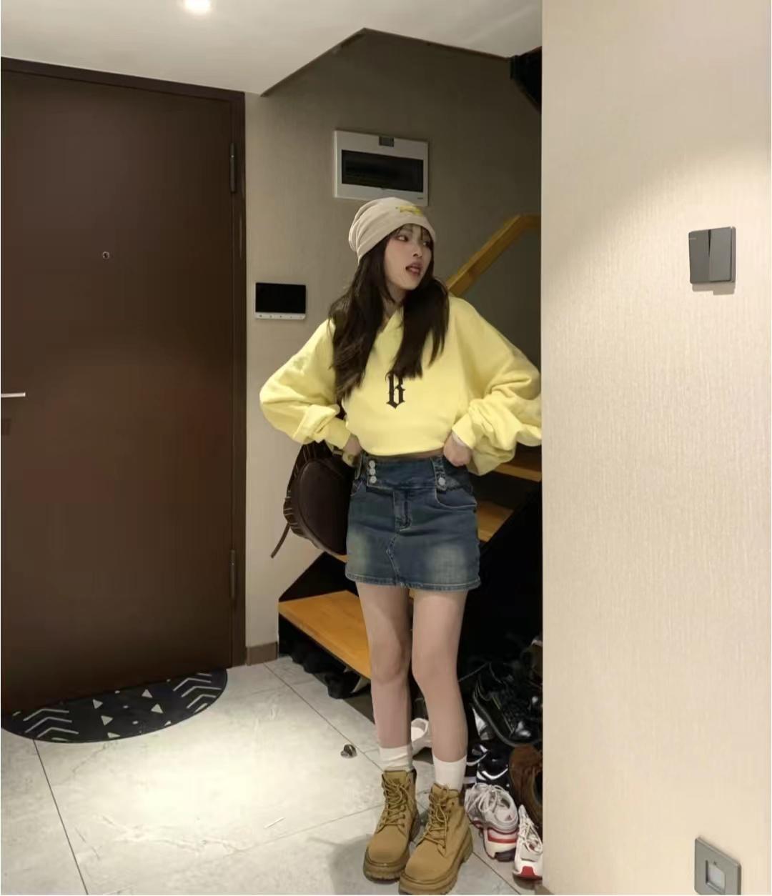 This set of American style The retro style is exactly what a campus heroine should feel like. This yellow color is really tender and not attractive at all. Skirts are also my favorite recently. The distressed denim color can be paired with any fancy top! It’s very stretchy and very comfortable to wear, and it looks good when paired with a sweater.