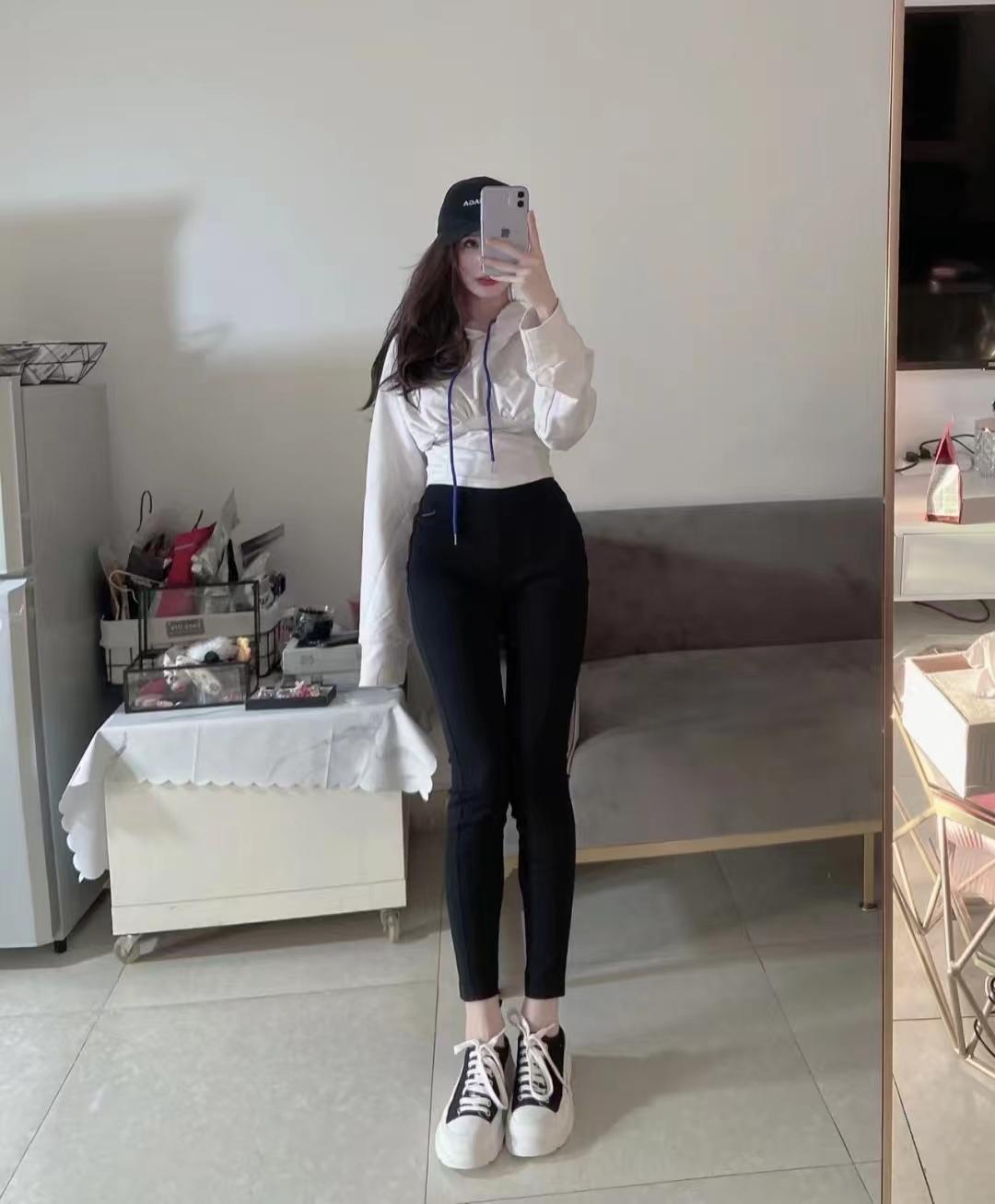 The matching of sweatshirts and tights is the most common matching method in daily life. The wearing rule of wide at the top and narrow at the bottom can easily create a good proportion of the figure. A pair of popular sports shoes can make girls look handsome and stylish, especially suitable for girls who like sports style.