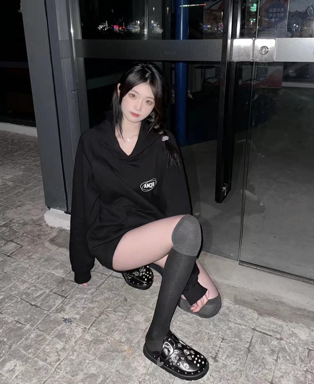 This The outfit is perfectly white, and the oversize design is short in the front and long in the back, which is very suitable for pairing with these tights. The matching colored socks also echo the color of the sweatshirt. I really like this kind of outfit for going out.