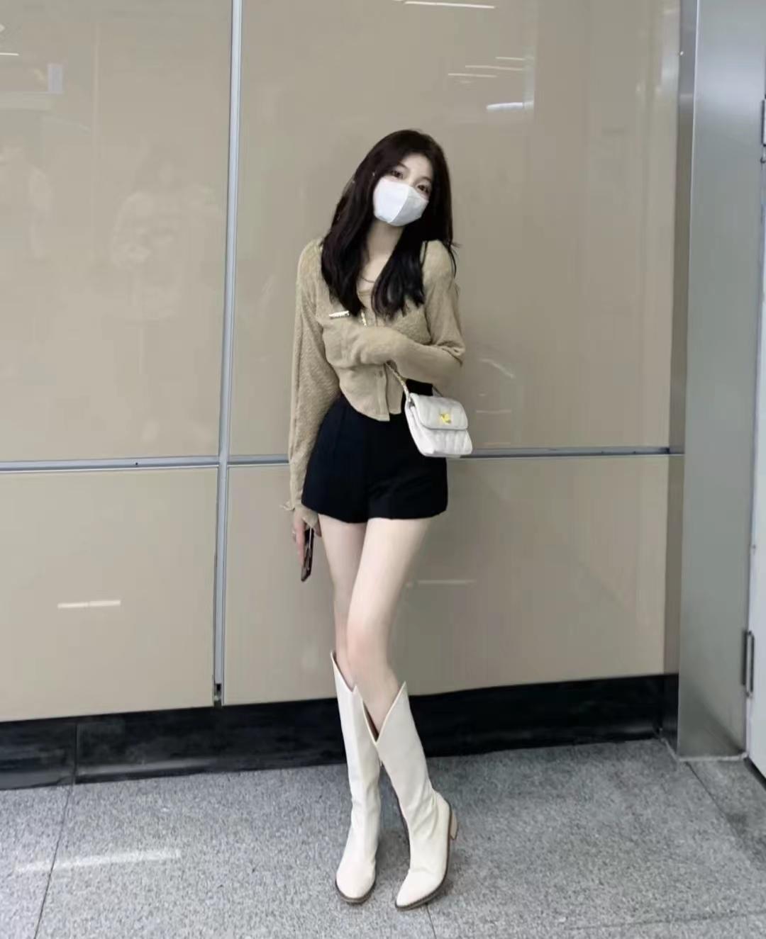 It’s a very gentle outfit. I wore this outfit to work and was praised by my colleagues. I was completely moved! Short top + shorts + white boots, the outfit formula is quick to save and save. The overall look is lazy and casual but also shows off your figure.