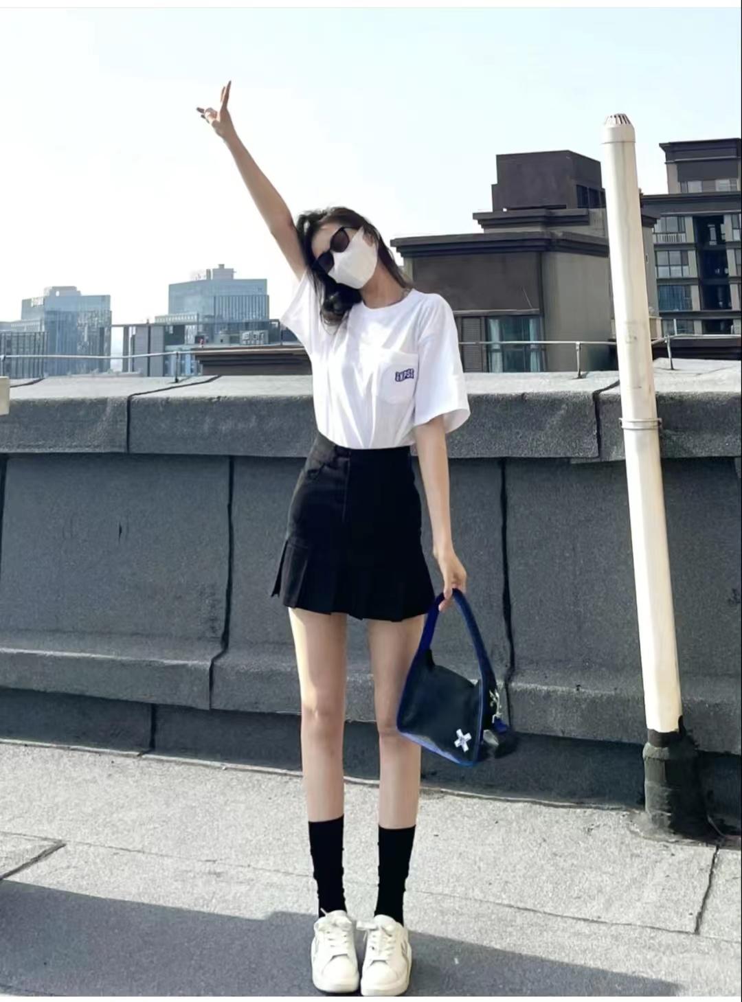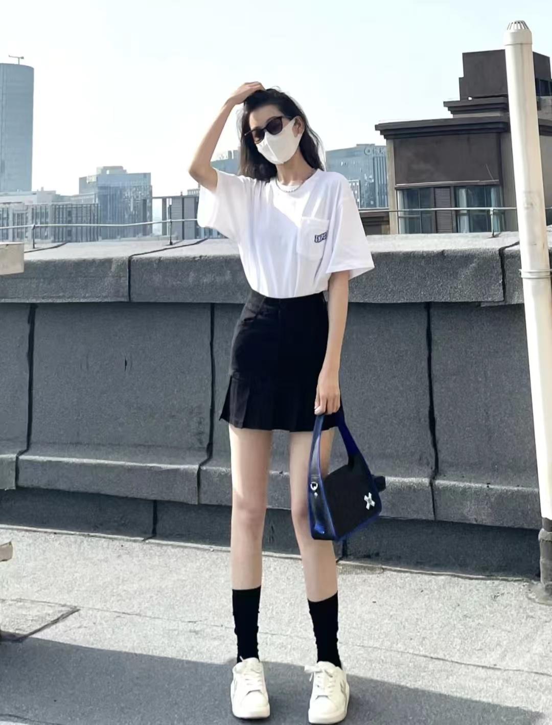 You can’t go wrong with any combination of white T-shirt + short skirt: white short sleeves + black skirt + black and blue bag. A white short sleeve is essential in summer. Sleeves, this short-sleeved shirt has a small blue logo on the chest, which makes it look less monotonous. It can be worn with pants or skirts. The bag is black with blue edges, which matches the blue logo on the T-shirt. echo.
