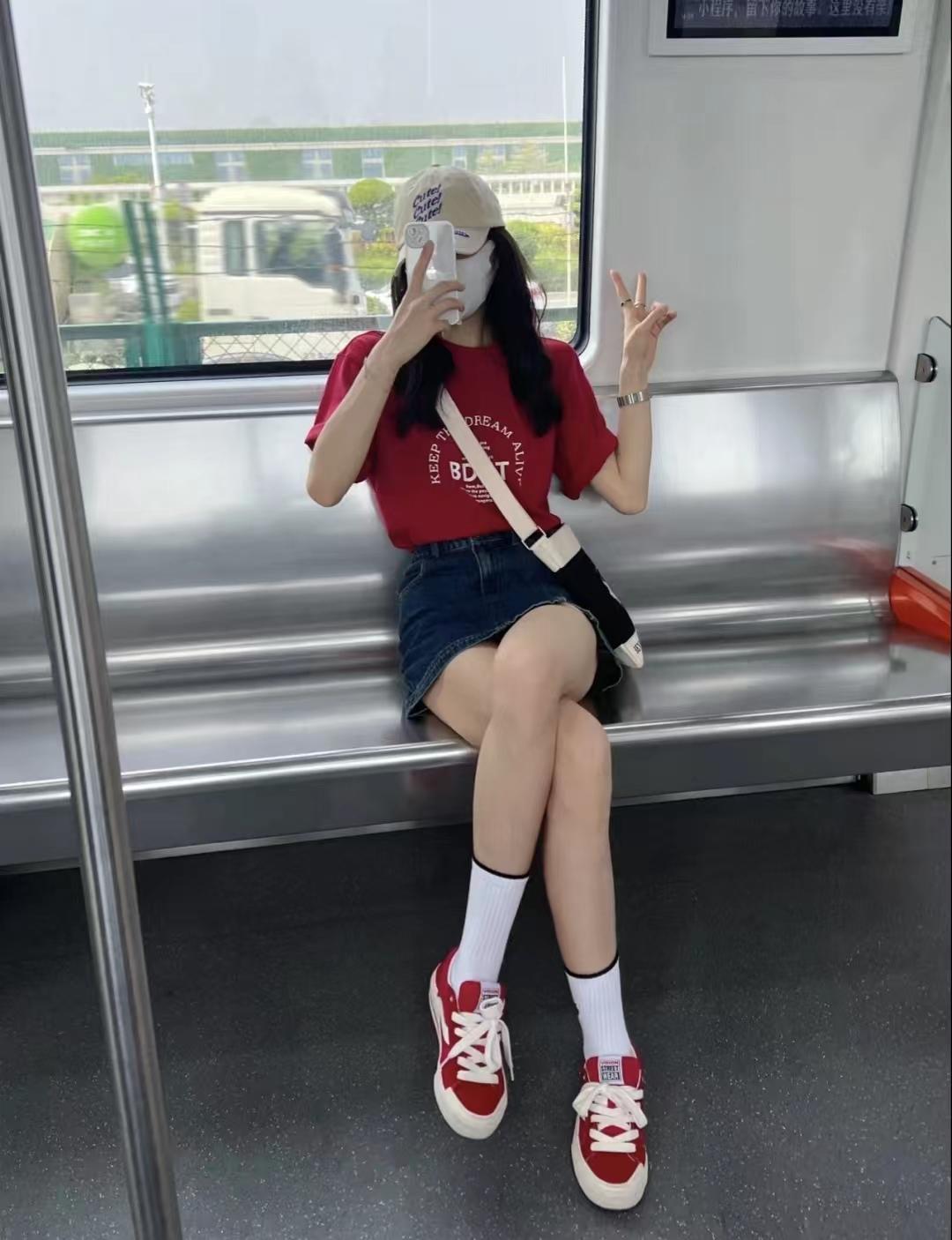 The red loose T-shirt with white letter design is also very comfortable. It can be worn in a loose Japanese style and can also be tucked into pants to show off your waist. It is really slimming when paired with a high-waisted A-line denim skirt. It can be paired with The red sneakers that match the clothes are casual and eye-catching, and this creamy white lettered baseball cap is also a versatile item!