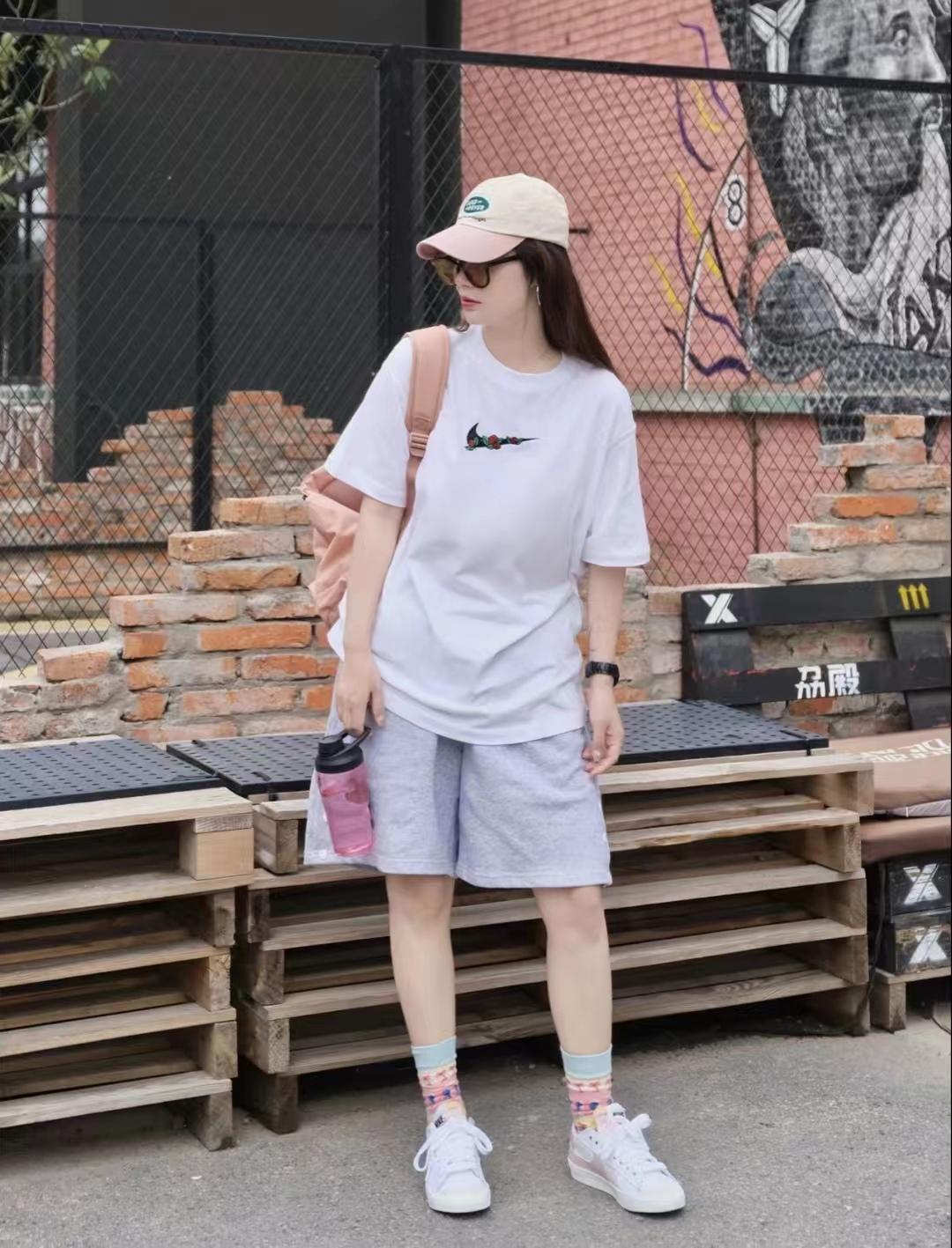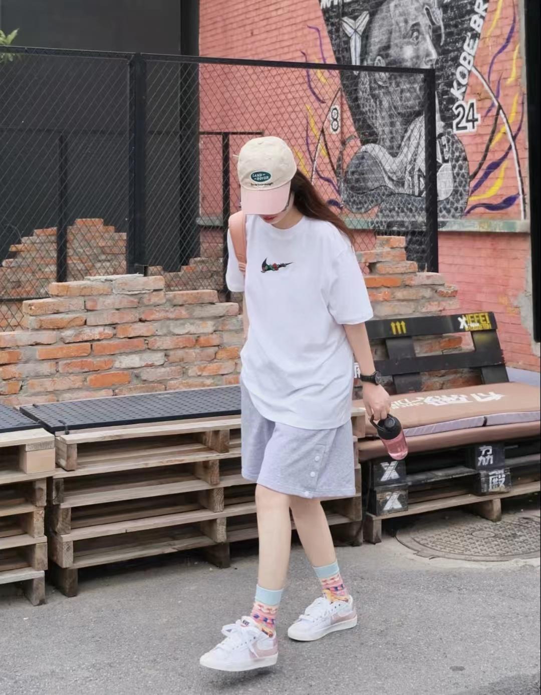 Outfit for summer outings: This look is full of vitality. T-shirt + shorts + sneakers is the summer outfit formula, right? Put a backpack on your back, Put on sneakers, the three colors of white, gray and pink are fresh and clean together, and the combination is full of vitality.
