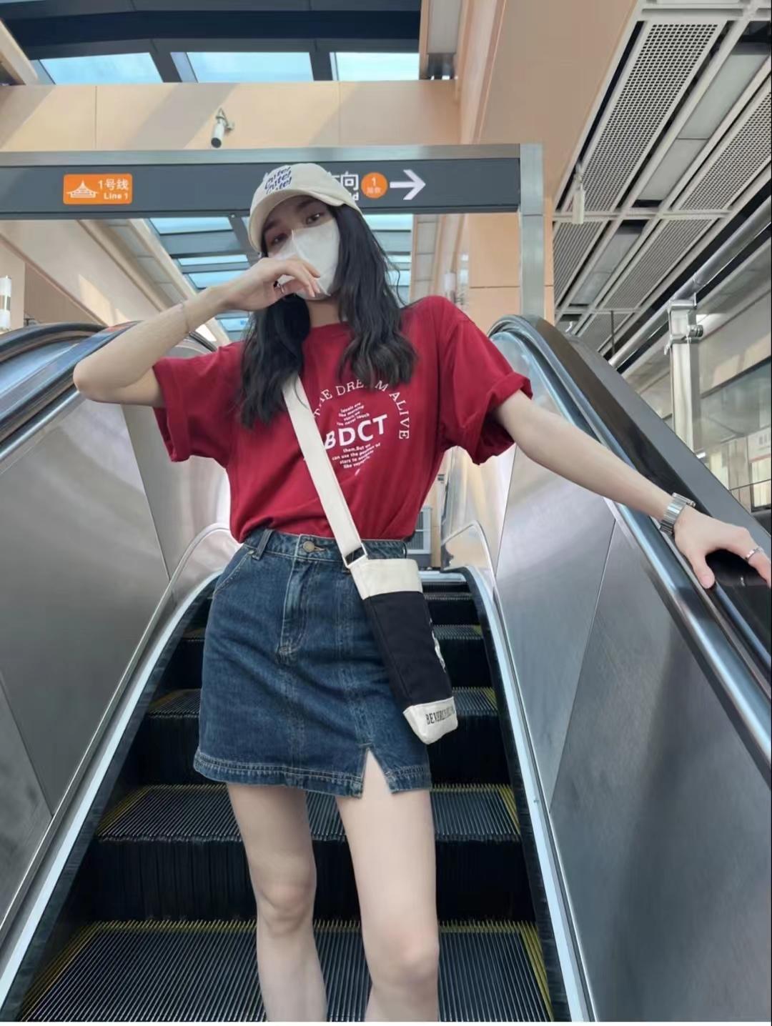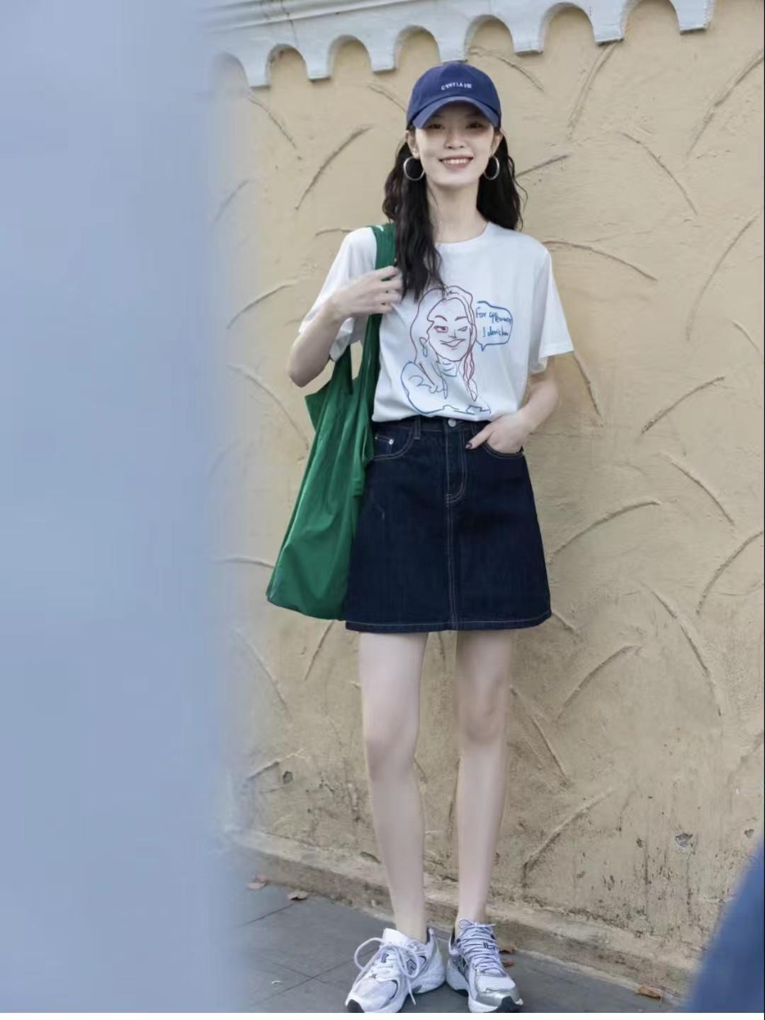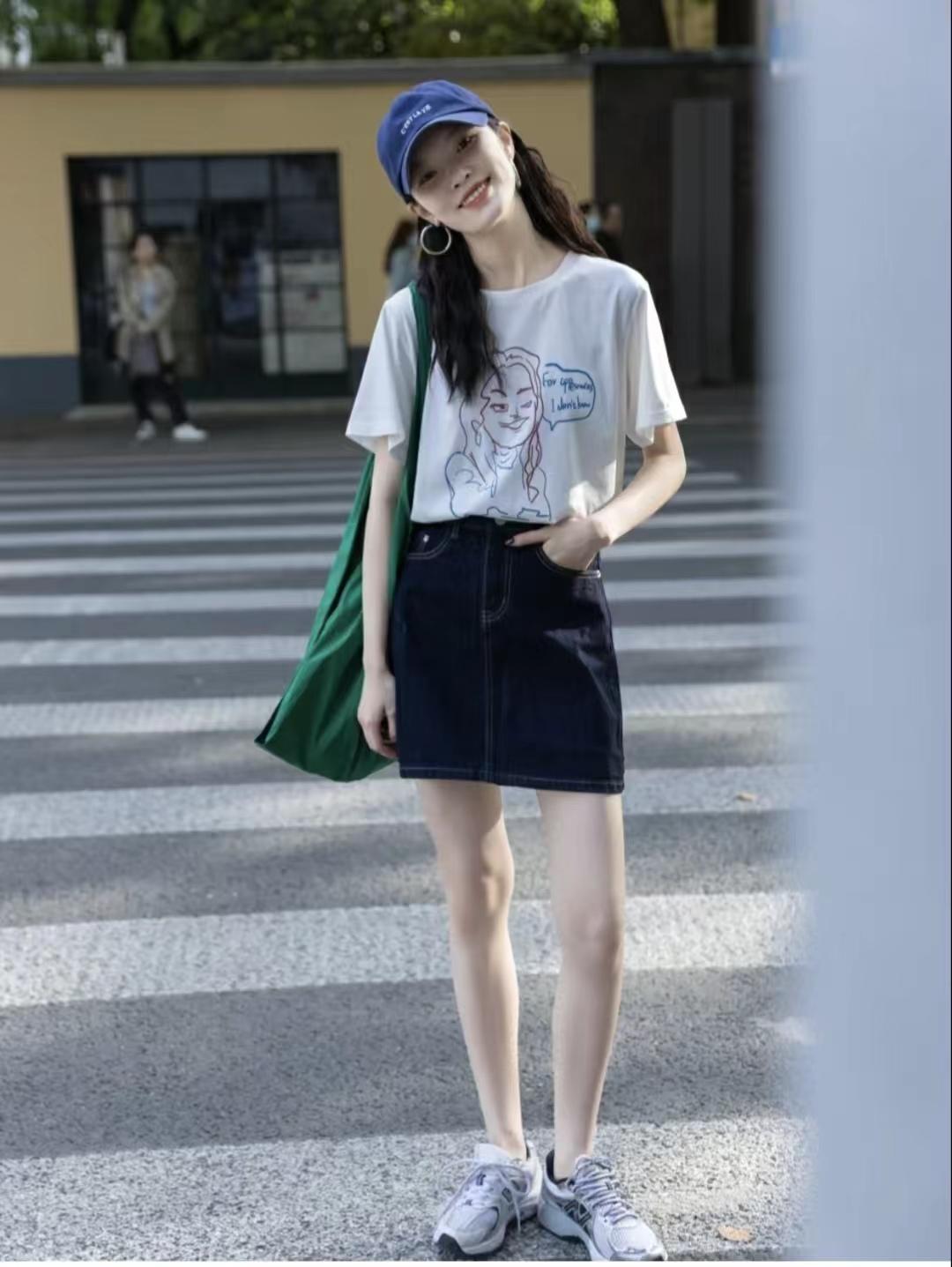 So Korean-style: the simple printed short-sleeves are definitely summer yyds!! Wear it casually on your body and it will make people unable to take their eyes away. The waistband is neat and the denim short skirt is the perfect fit. He is tall and thin, and the overall soul embellishment must be a handsome baseball cap. This casual and energetic Ernie outfit will quickly become popular.
