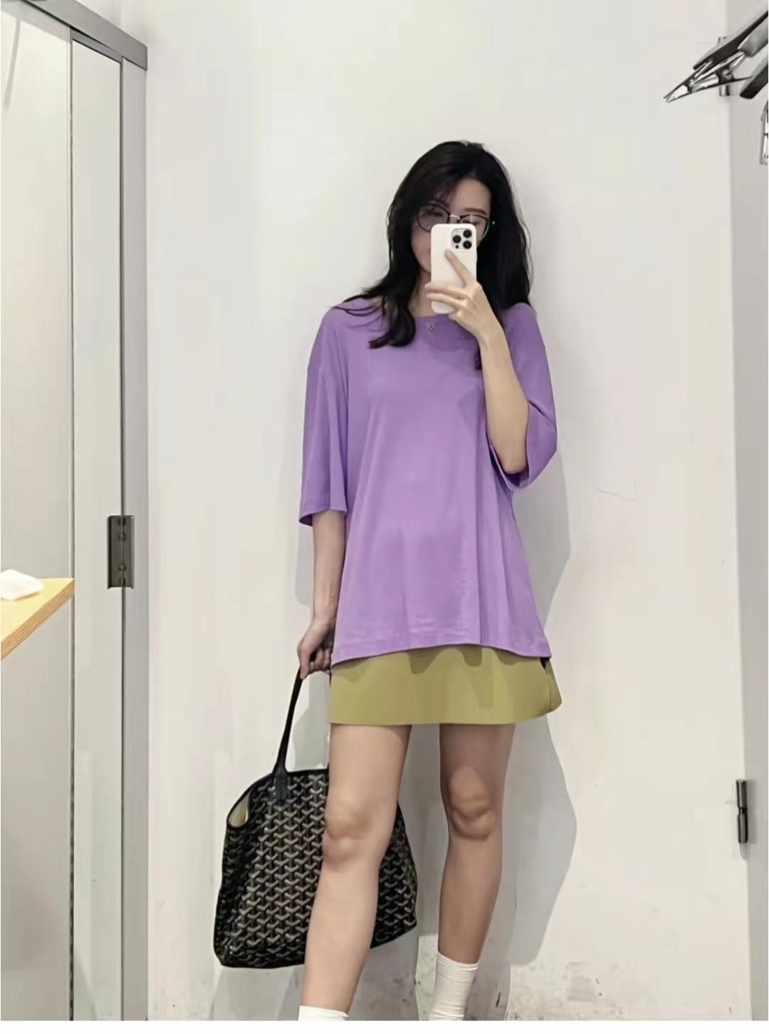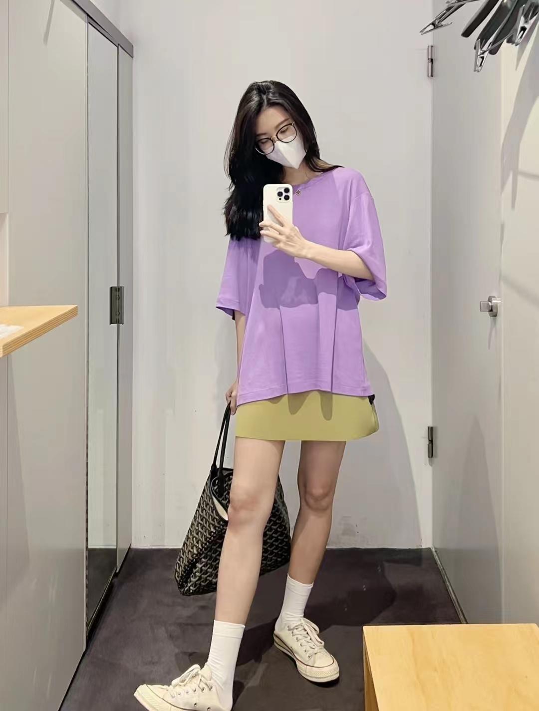 This set is eye-catching Comfortable match, onI chose a white loose purple T-shirt, and paired the lower body with a green short skirt. Both are white in color, and the clothes feel very comfortable. I wore white socks and white canvas shoes on my feet, a lazy combination. Suitable for hot summer days.