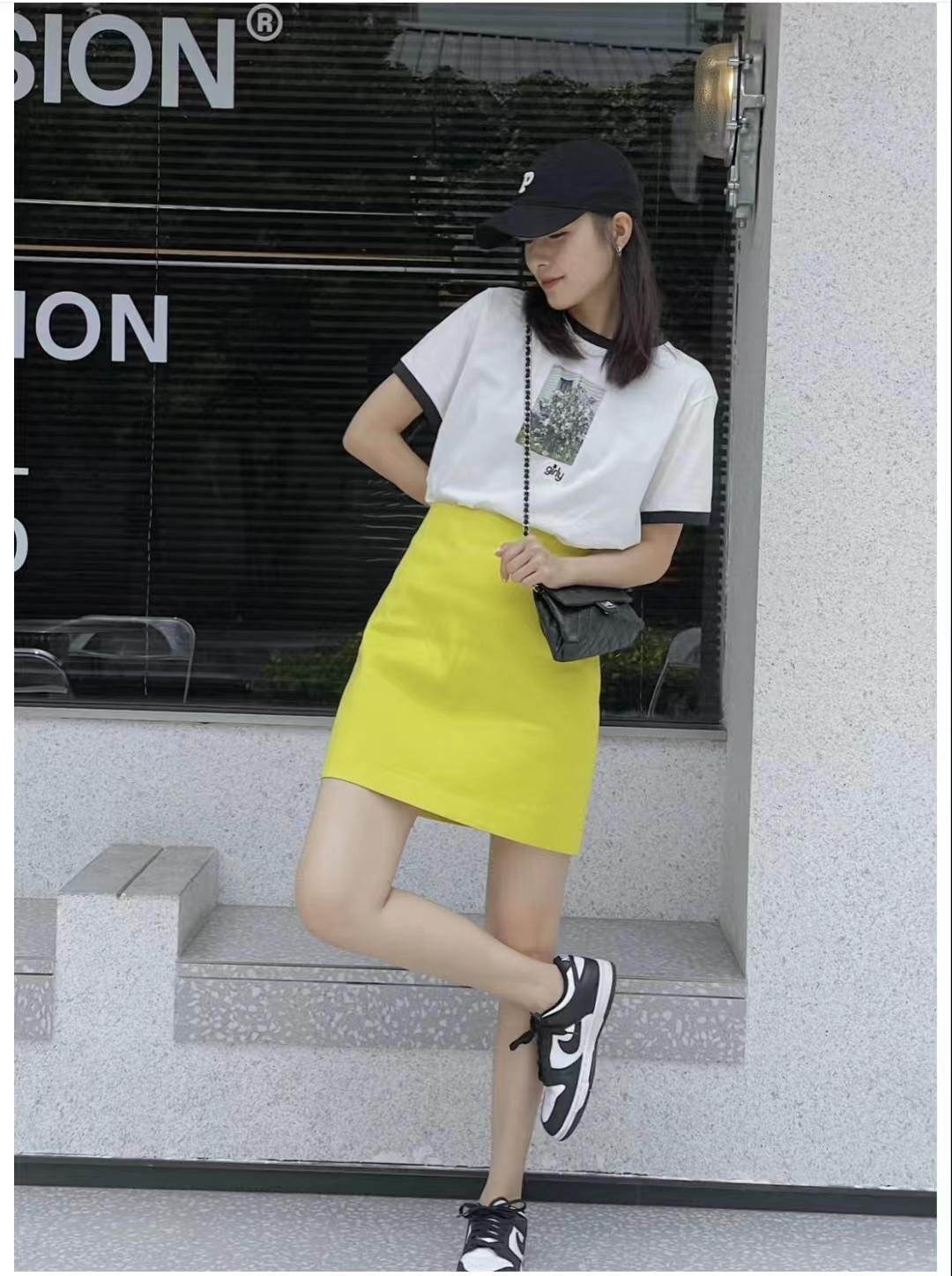 T-shirt and short skirt are so cute that you want to touch your head: usually wearing a T-shirt makes the whole person look ordinary, this color is It’s off-white, the fabric is very good, the loose fit can cover the pp, it’s quite oversized, roll up the sleeves to add a sense of layering; the lower body is paired with a popular short skirt, which is also off-white, and goes well with a T-shirt.
