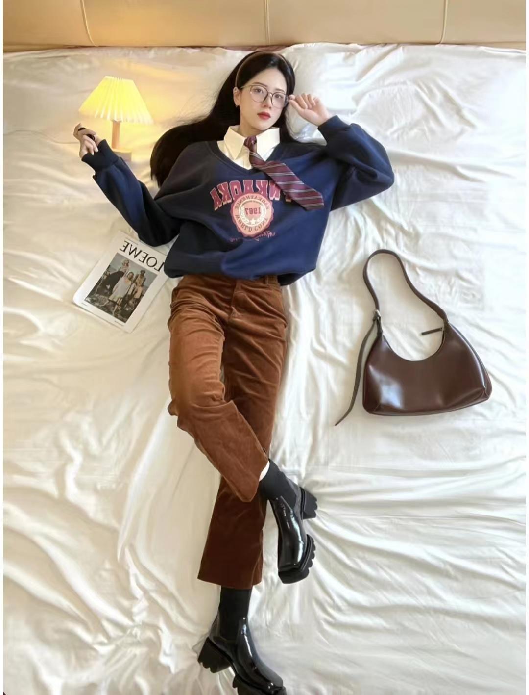 American retro college-style sweatshirt, the blue and brown color scheme has a 90s feel. This outfit idea is a fake two-piece tie sweatshirt + brown corduroy pants. It is a layered and full-textured outfit. Paired with a pair of thick-soled Chelseas, a small person can still be a sweet and cool senior.