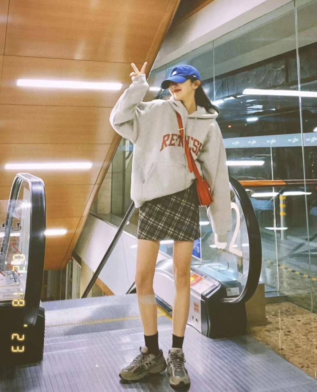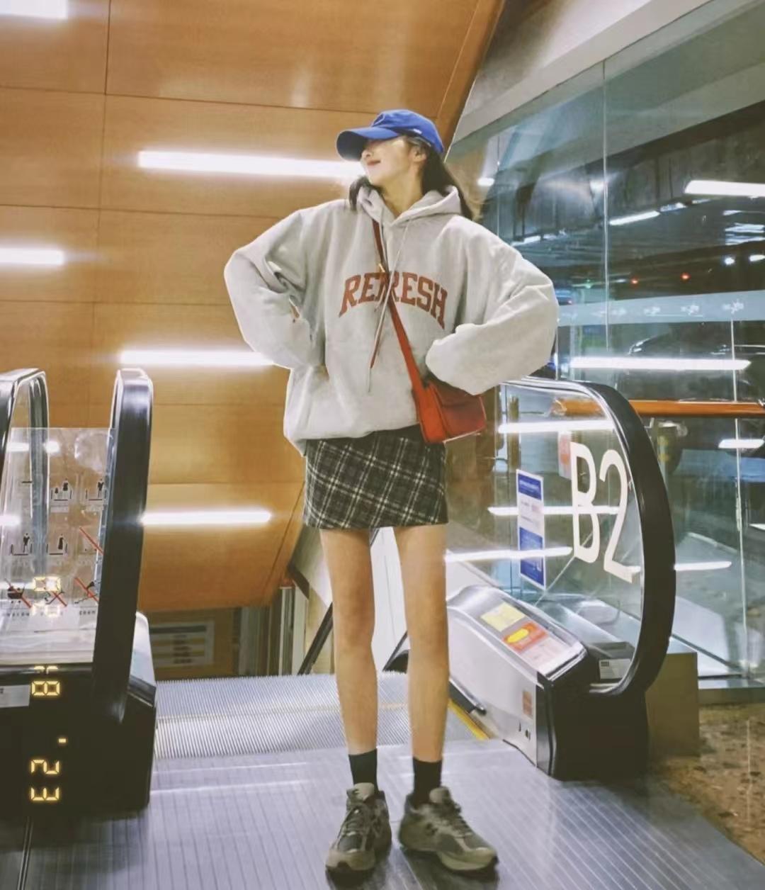 I really like this set of gray hooded American sweatshirt + plaid skirt. I really like this red letter sweatshirt. It looks good and comfortable on the upper body. It matches the short plaid skirt + gray N-shaped shoes, American sweet and cool style are my favorite!