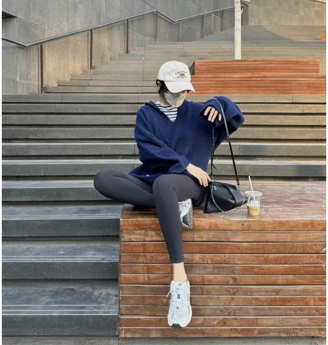 Wool knit No matter how you pair sweatshirt + leggings together, they look very Korean! The wool knitted hooded sweatshirt reduces age and is very suitable for commuting. It looks great when paired with leggings and jeans. You can choose either striped or pure white T-shirts for inner wear. The wide top and narrow combination is perfect for spring.