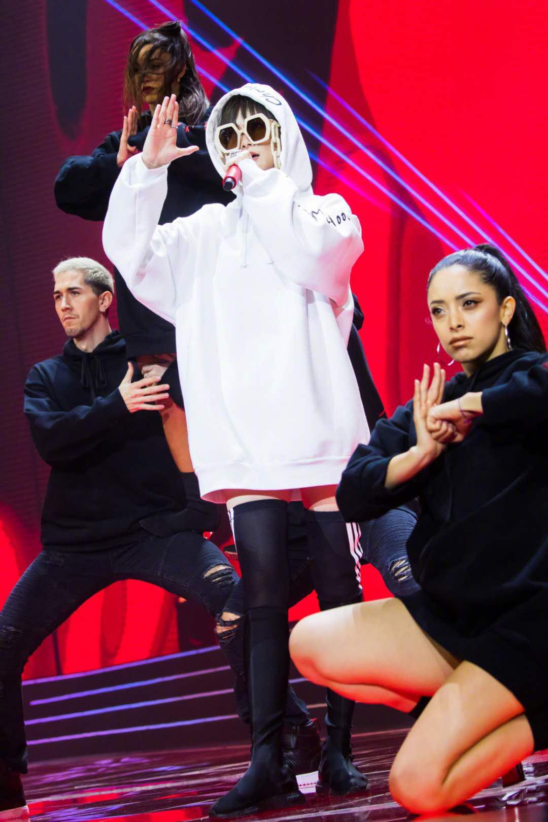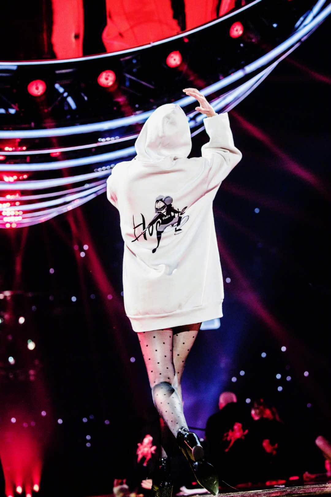 Li Yuchun finally changed his style, covering his whole body with a sweater, paired with polka-dot stockings, which is full of femininity. In the public’s mind, Li Yuchun mostly presents a neutral image, as if feminine things are not relevant to her, so when she tries on stockings, she can always easily catch everyone’s attention. . She also used stockings in this look. Compared with the sexy and sultry black stockings, the white stockings are more cute and make the all-white look look more coordinated.