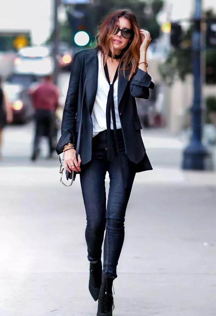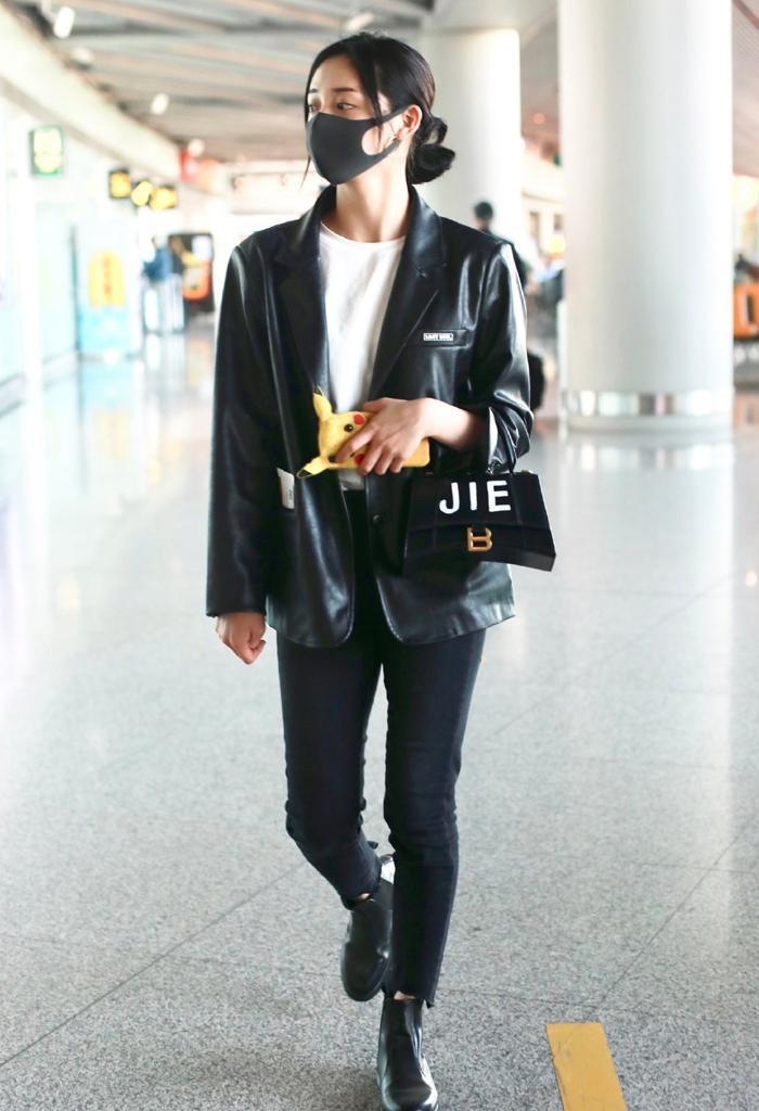 Girls who prefer street style can challenge more stylish leather suits when wearing this combination. The smooth and glossy leather material can add to the fashionable attributes of the suit, giving it a retro motorcycle look that is both cool and cool. Paired with a white T-shirt, it makes it more casual and free. Zhou Jieqiong once wore a leather suit and a white T-shirt. The three-dimensional silhouette made the whole person taller and taller, giving her a unique and handsome style.
