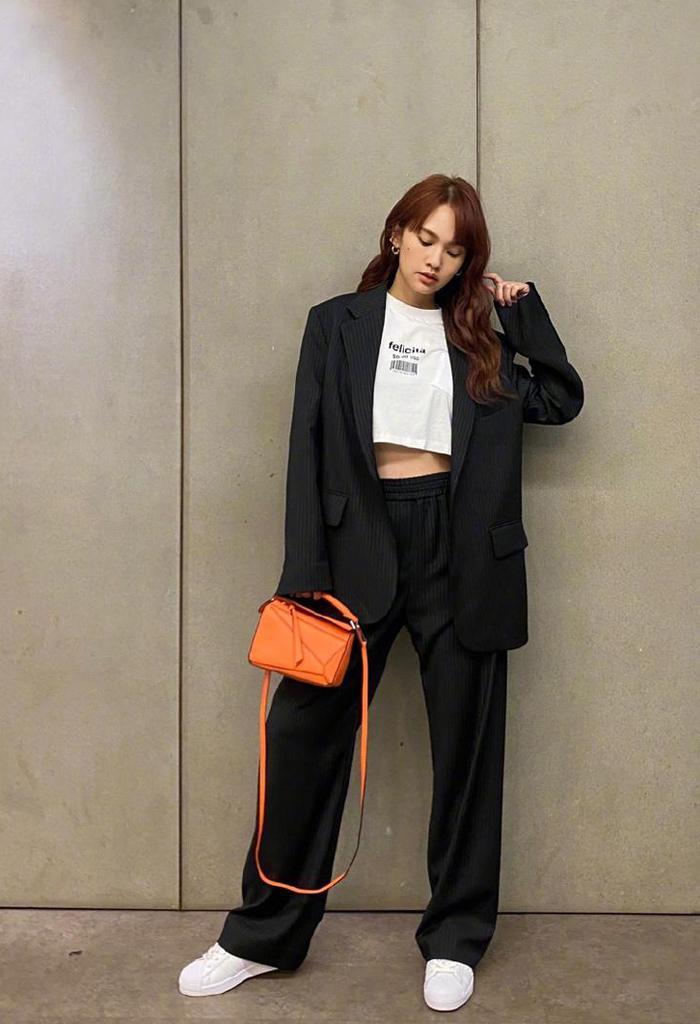 Sisters with a small waist can choose navel-baring T-shirts that can better highlight their figure advantages. They are more personalized and stylish than ordinary T-shirts, and can also enhance the entire look by exposing the skin appropriately. The sexiness index allows people to shift their attention to the waist and abdomen, showing off a good figure easily. Rainie Yang knows how to make use of her figure. When wearing a suit, she wears a navel-baring T-shirt underneath, and even wears it with high-waisted suit trousers. Instantly elongates the proportions of the lower body, making the legs look slimmer and longer, and the whole look is so sassy.