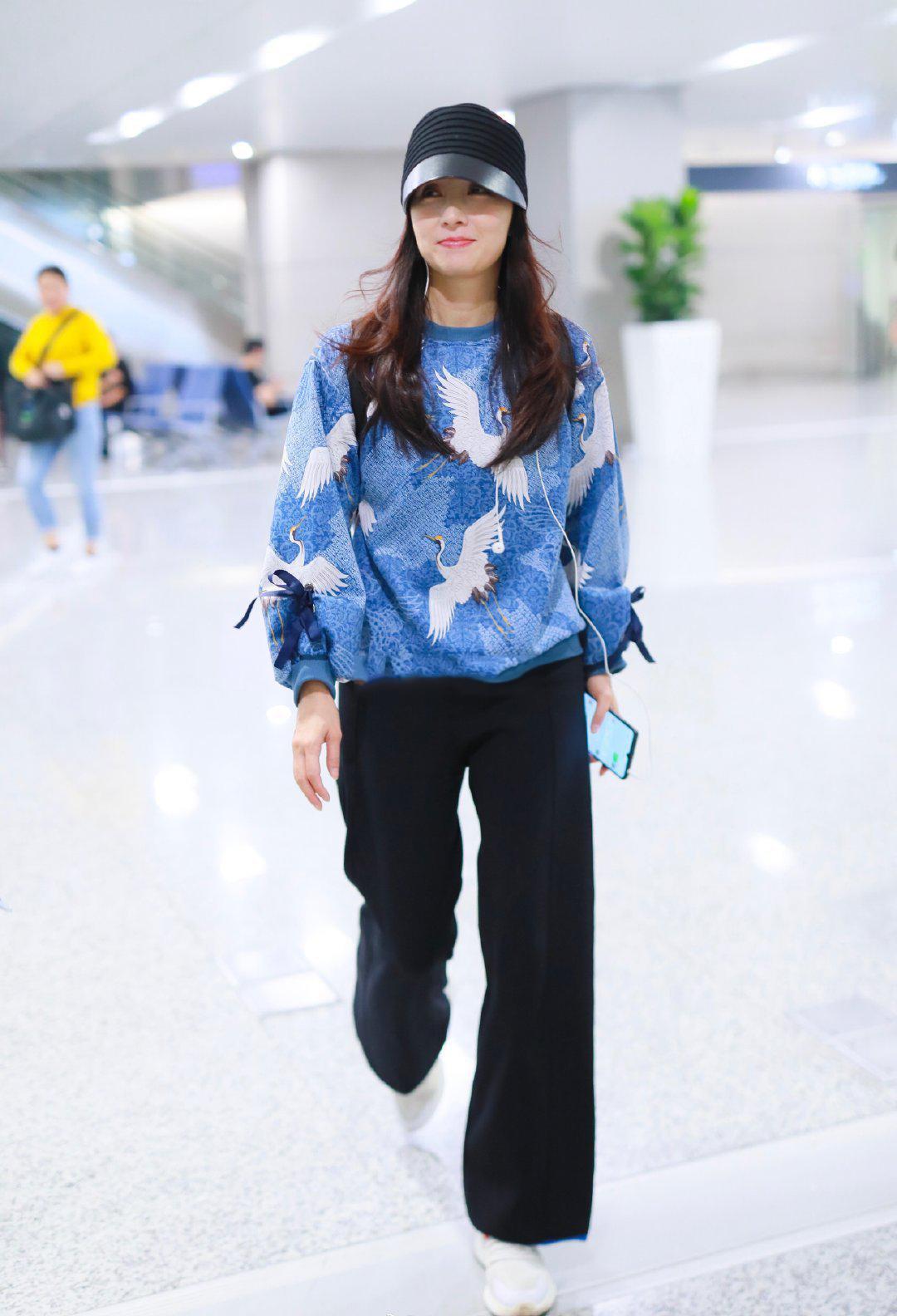 Most middle-aged women have signs of gaining weight and tend to choose loose-fitting styles. The bottoms they wear when wearing sweatshirts are also loose-fitting. Tailoring is the main focus, so wide-leg trousers are a good choice. The wide trouser legs cover the flesh and make you look slimmer. As long as the trouser legs are not too wide, you are not afraid of the negative effect of the horizontal widening ratio. The casual design complements the style of the sweater. Tao Hong’s blue printed sweatshirt + black wide-leg pants are very relaxed and comfortable. The round neck style is simple and elegant, and the printed embellishment does not look monotonous at all.