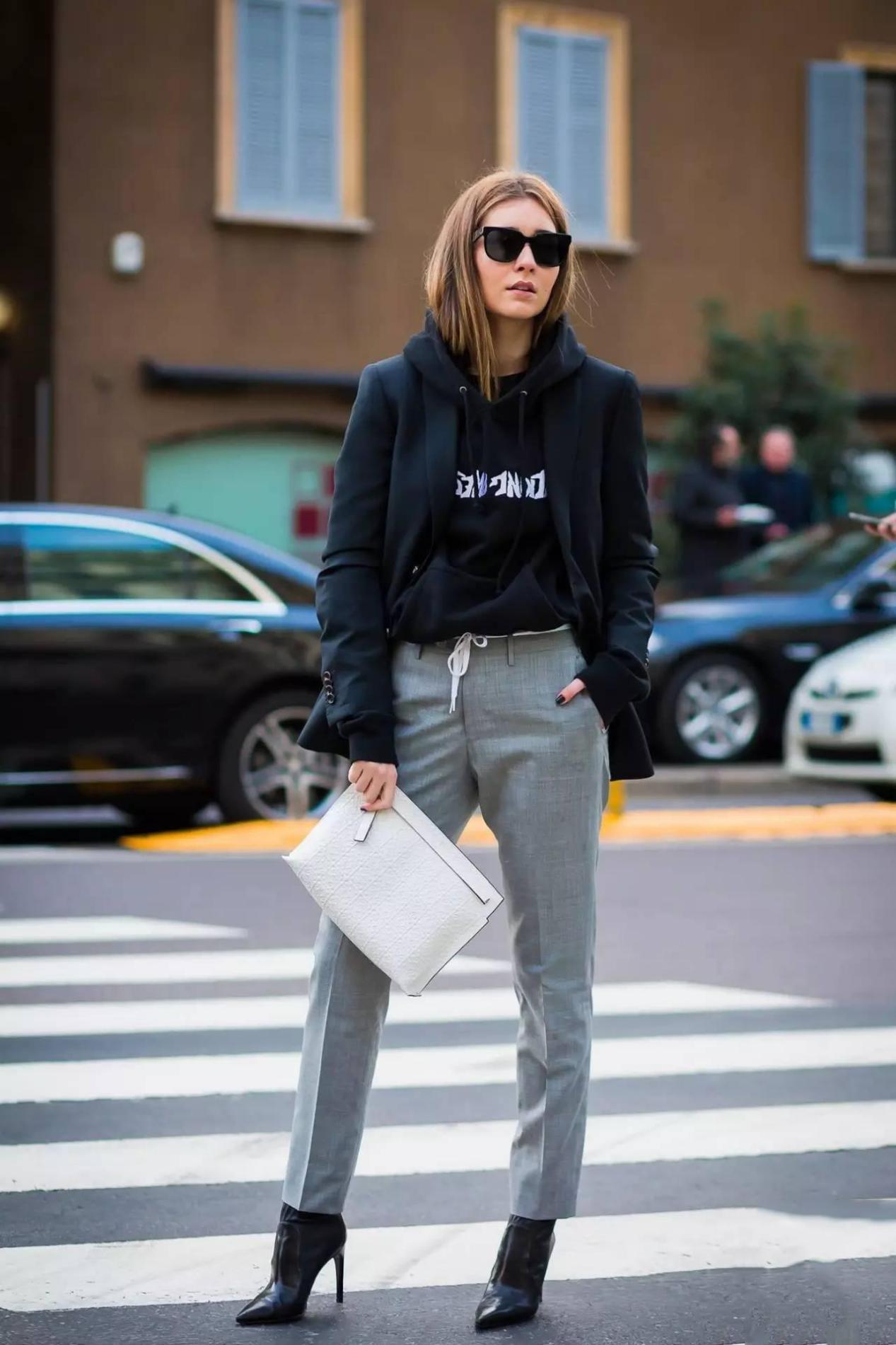 Some people think that the styles of sweatshirts and suit pants are too different, and the combination will be very abrupt and different. In fact, this is not the case. There are rarely mistakes in the matching of sweatshirts with simple and neat designs, and they can control the differences. Different styles of bottoms can show a different sense of fashion. I really feel that the abruptness is too strong, so it is better to layer jackets of the same style. Like this, choose suits and suit pants of the same style to match the sweatshirt, which is decent and generous without losing the sense of vitality. With the embellished red sweatshirt, the look will not be too lifeless, but a little retro.