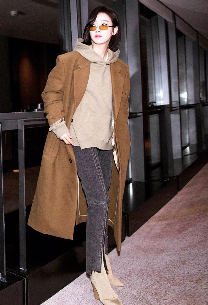 If you are wearing It is a basic color sweatshirt item. You can be more “bold” in the choice of coat accessories. Try to choose styles with plaid print embellishments. The overall design is more simple and elegant than other printed items, and it can also be used as a decorative item. To enhance the fashion sense and recognition of the entire look. Yang Rong’s airport outfit is a good example. She wears a plaid mid-length woolen coat and a pure white hooded sweatshirt. The whole look is both neat and stylish, but also unsightly. It will feel too boring.