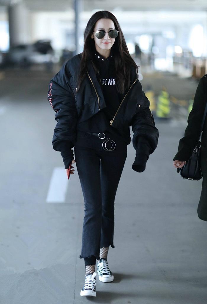 The bomber jacket was first used as the standard “battle uniform” for the Air Force. As designers changed the fabric and style After the revision, it gradually evolved into the current short-cut style. Not only does the upper body look handsome and stylish, but the short length design can also be used to optimize the wearer’s body proportions. It is a perfect match for a sweatshirt.One of the best choices. For example, Dilireba wore a sweatshirt and bomber jacket, paired with bootcut jeans. The overall pure black tone instantly transformed her into a cool girl, and it also had an obvious slimming effect.
