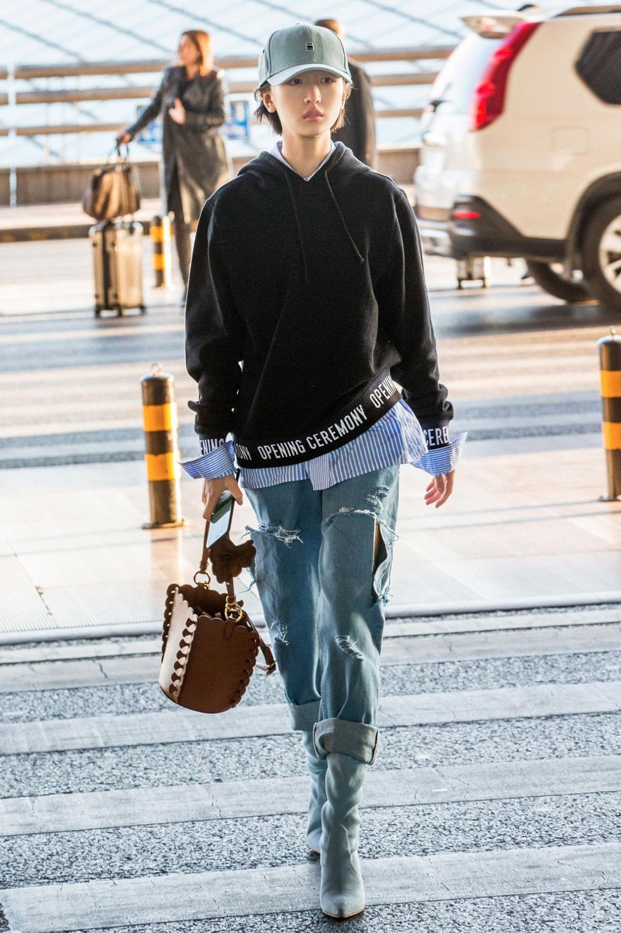 In many combinations Among them, sweatshirts + jeans have the highest appearance rate. As a classic item, jeans are rich in styles and can meet a variety of style needs. The stiff fabric brings a very good modification effect. Skinny jeans are sexy and show your figure, while straight-leg and wide-leg pants are more attractive. Covering the flesh makes you look slimmer, and the freshness of denim blue can make the look look younger. It is also consistent with the style of a sweater, but it is more fashionable than sweatpants. Zhou Dongyu’s airport outfit is to wear a sweater with ripped jeans, using layered The way to wear a shirt is to get rid of the popular feeling.