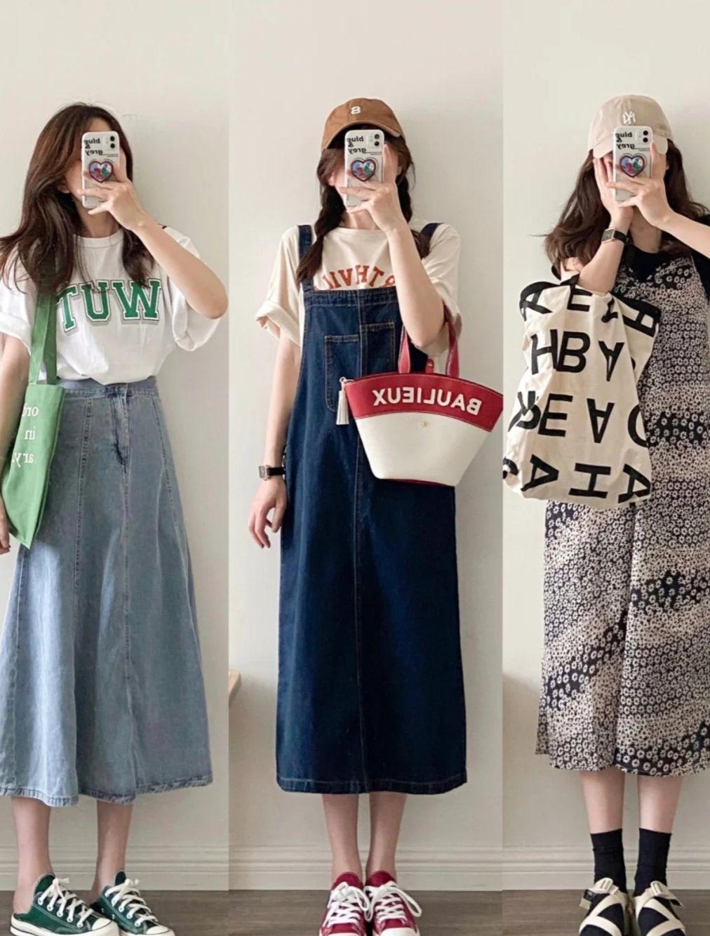 Girls who want to lose age and look younger should choose a T-shirt layered with a suspender skirt to create a sweet girlish look. Pair a white printed T-shirt with a navy blue denim suspender skirt. The refreshing color scheme is particularly flattering to your skin tone and makes you look younger without overpowering the look, allowing you to create an effortless fashion look.