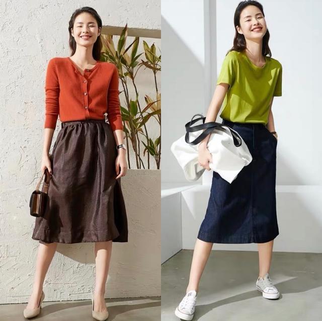 Eye-catching orange top paired with dark brown half-dressSkirts are the most popular knitted T-shirts this year. They are particularly easy to control and are versatile and easy to wear regardless of body shape. Compared with pure cotton T-shirts, they have a little more details, making them appear more connotative and enhance your sense of temperament.