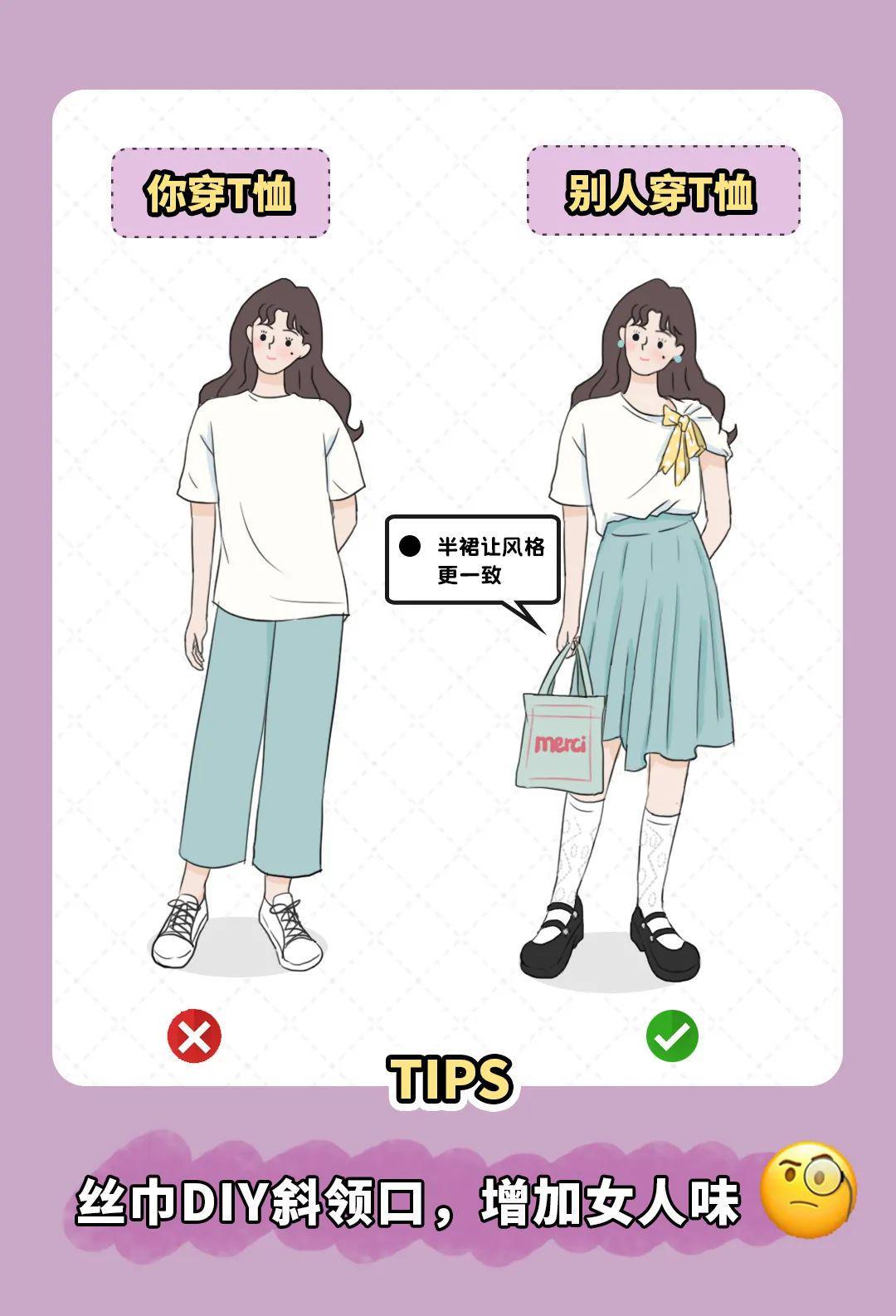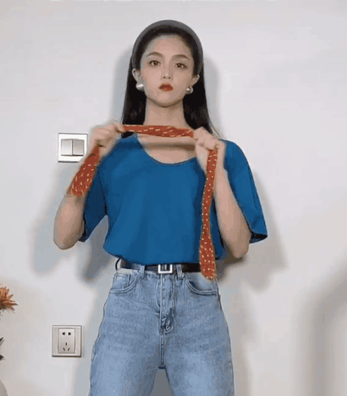 First of all, let me share the first tip, which is to use a small silk scarf. Don’t think that those silk scarves are just props for mothers to take photos when they go out to play! This is not the case, today we use it to add style to your ordinary outfit! You must have a solid color T-shirt in your wardrobe that you are tired of seeing. Don’t think about throwing it away. You can tie a colorful silk scarf on the shoulder and use a small area of contrasting color embellishment to change the look of passersby.