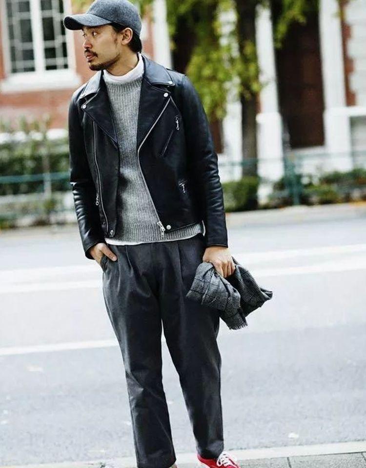 Pair a black leather jacket with a gray sweater, which is soft on the inside and strong on the outside to enhance the look. The lower body is paired with gray casual trousers and red canvas shoes. , wearing a baseball cap adds more fashionable elements.