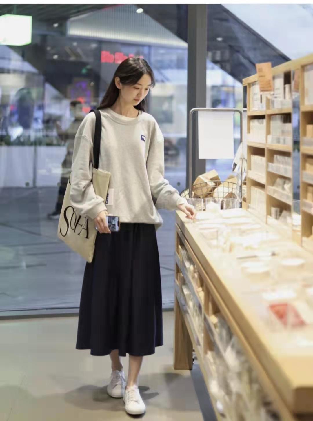 Pairing a sweatshirt with a long skirt is also a very popular trend recently, and it is more elegant than pants. It is soft and suitable for gentle sisters to wear. The simple style is more fashionable, unobtrusive but very fashionable.