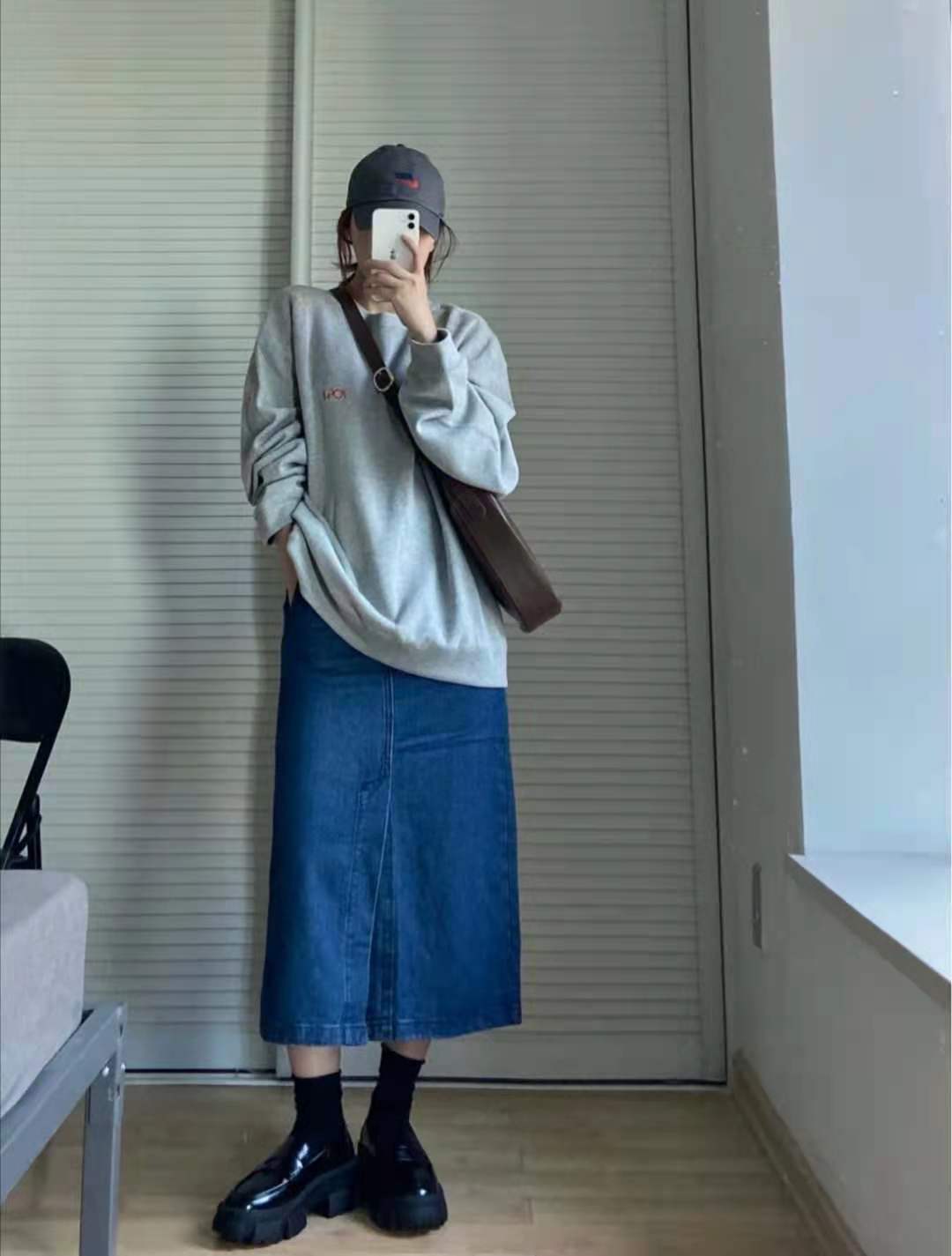 The black skirt is more gentle, the denim-like skirt is more tough, and the gray sweatshirt is more Wear a denim skirt, which is casual and has a good sense of design. You will look the brightest when you go out on the street.