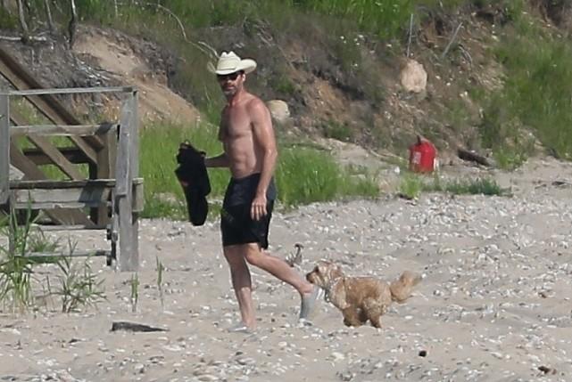He loves dogs as much as anything else, and he always takes his pet dogs with him when he goes to the beach. Hugh Jackman in “Walking Dogs on the Beach” wears black cargo shorts and a sun hat to cool down and relieve the heat. His toned muscle lines look young and energetic. The dog ran around at his feet and was very lively.