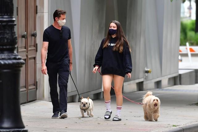 Even when I go out with my daughter, I don’t forget to bring my dog with me. Although my daughter is also wearing a mask, she still looks very good-looking. Dressed in black, Hugh Jackman’s short-sleeved and long trousers have a cool summer feel. He chose black for the look, and his daughter’s black sweatshirt looks like a parent-child outfit.