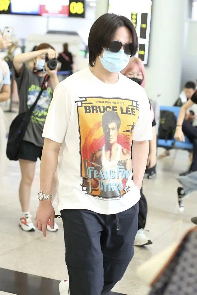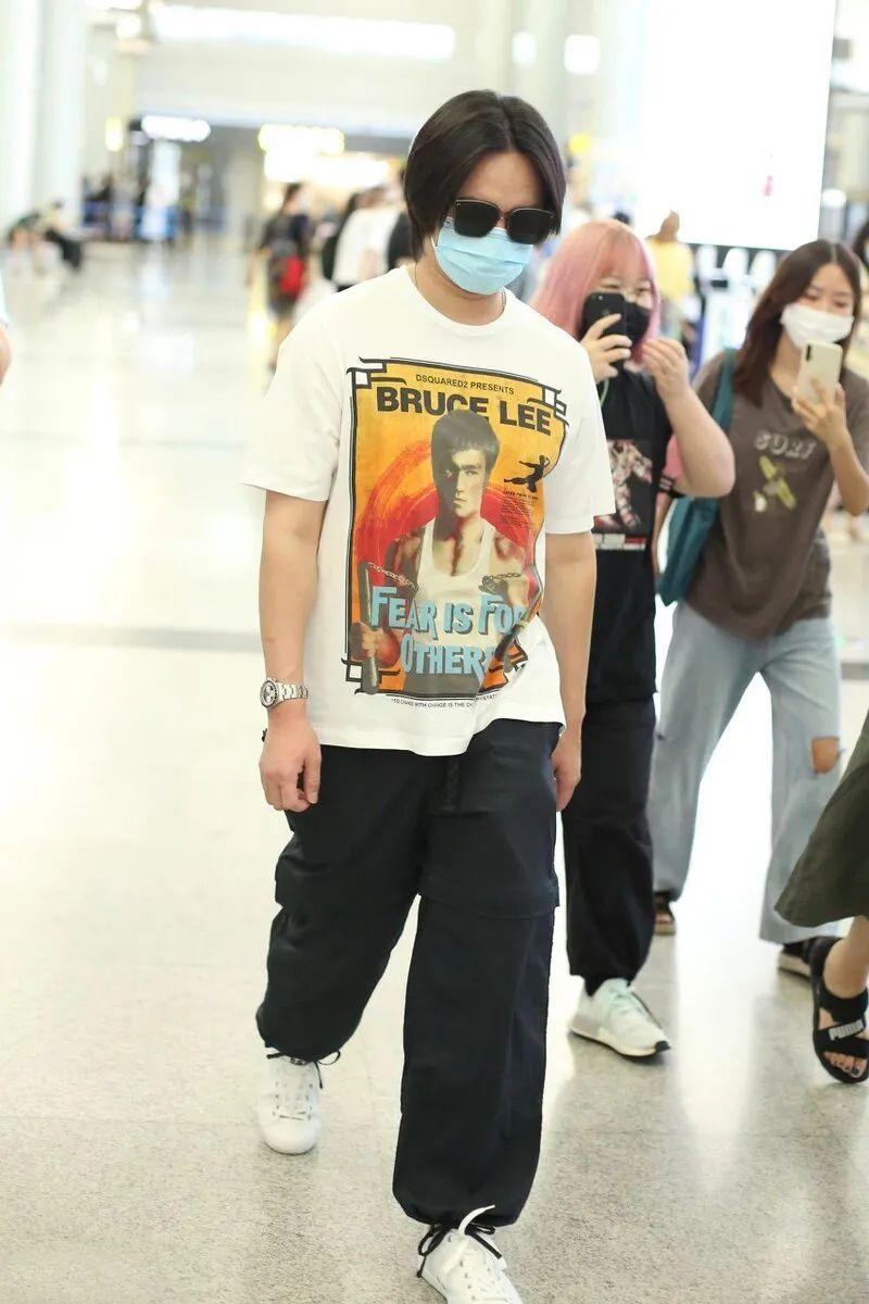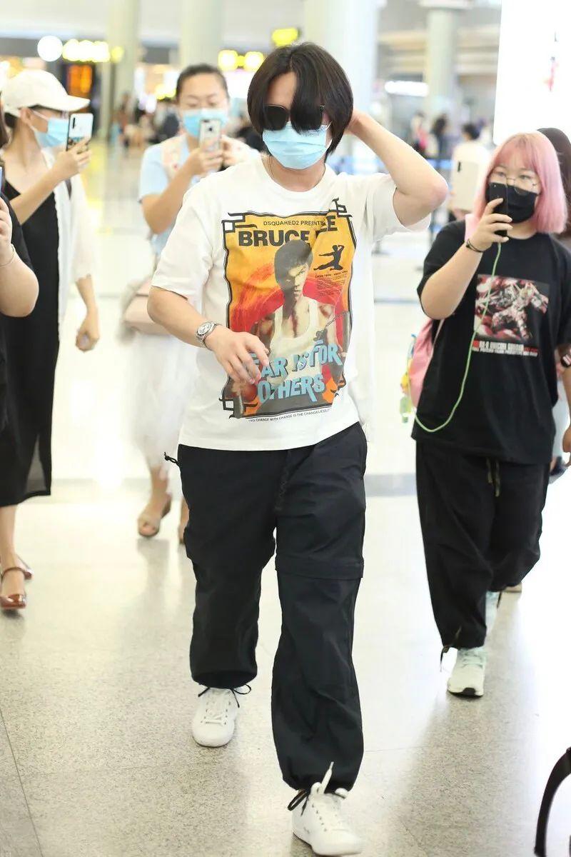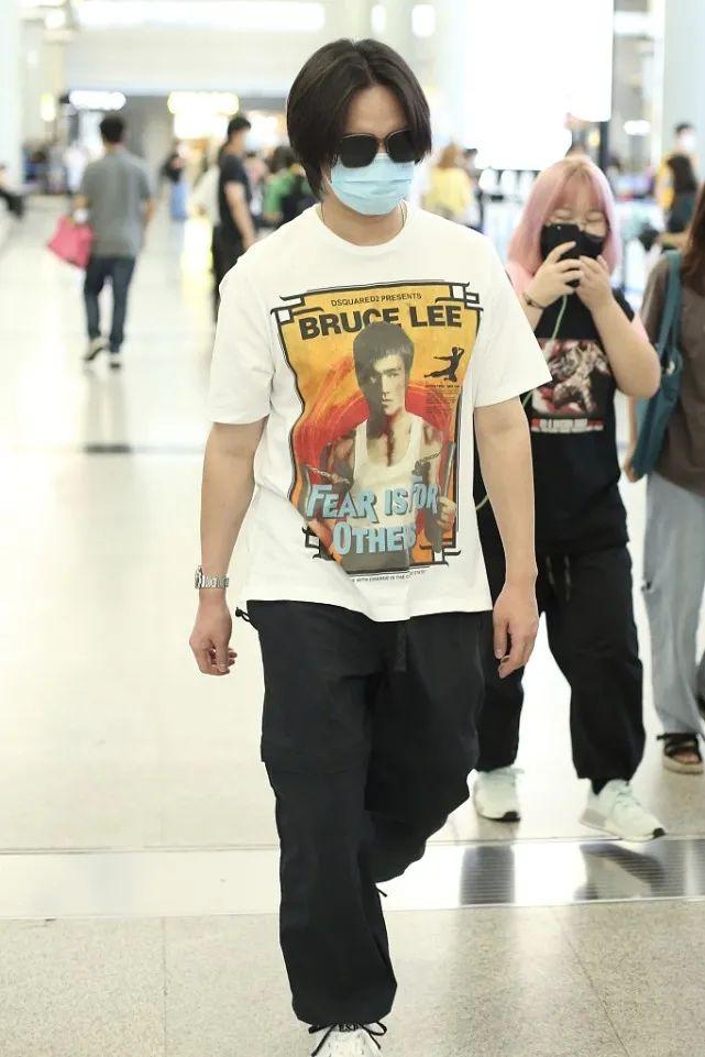Recently, Yin Zheng appeared at the airport wearing a “Bruce Lee T-shirt”, and with a middle-parted hairstyle, the look was full of retro style. In T-shirts, printed patterns are very iconic elements. Classic small logos, personalized text slogans, and various styles of stickers are very common in T-shirts.